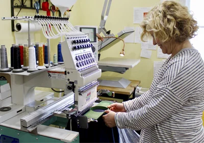 Terri Ehrman places a piece of fabric in the hoop of the embroidery machine at her business, Interthread Embroidery.