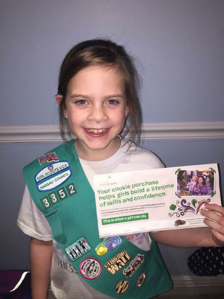 Melville resident Adele Tongish helps her 5-year-old daughter, Alora, sell cookies as a Daisy. The kindergartener has a lot of help from her parents – her father helped a uniform-clad Alora use cell phone software “Facetime” to chat with out-of-town relatives; her mother helped her send out emails – in making use of technology-related outreach methods.