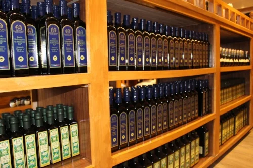 Shelves of traditional and aged balsamic from Modena, Italy.