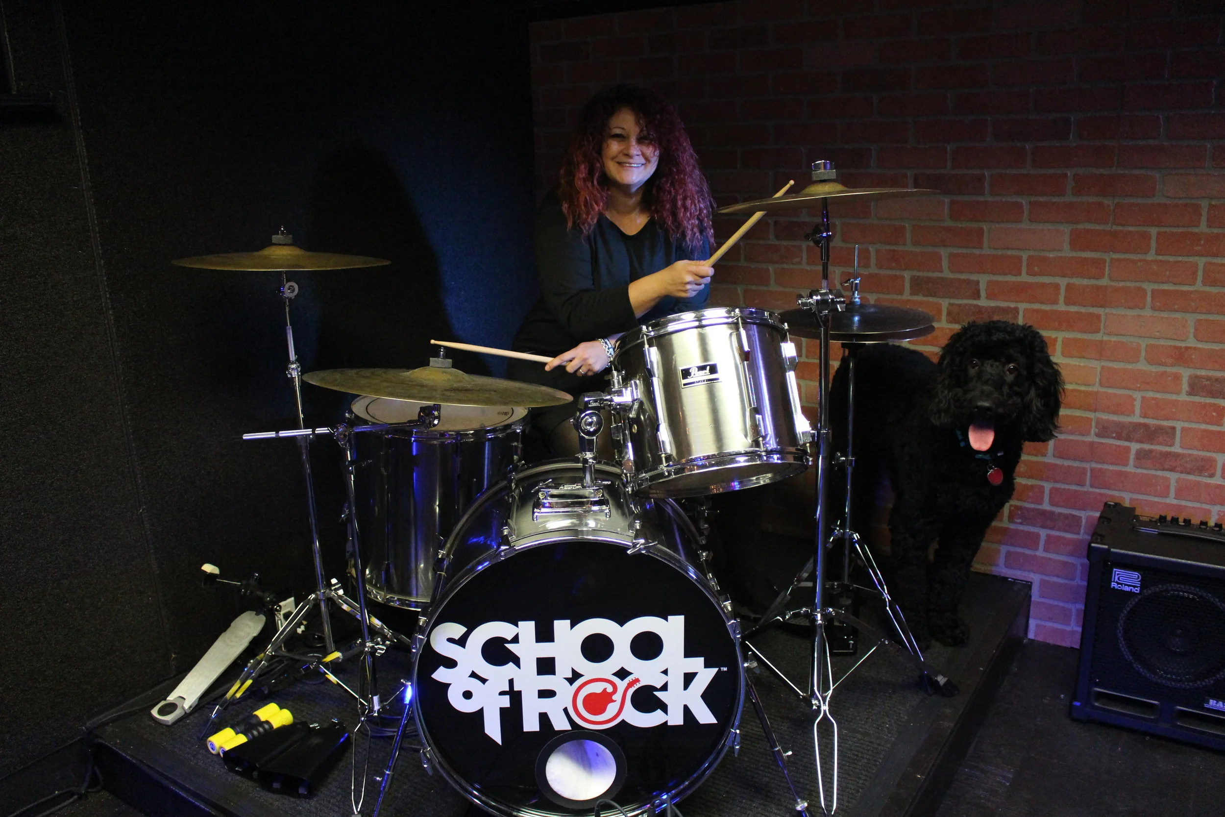 Owner and General Manager of School of Rock Monica Rubin, with mascot Wally, said that if she could play one instrument, it would be the drums.