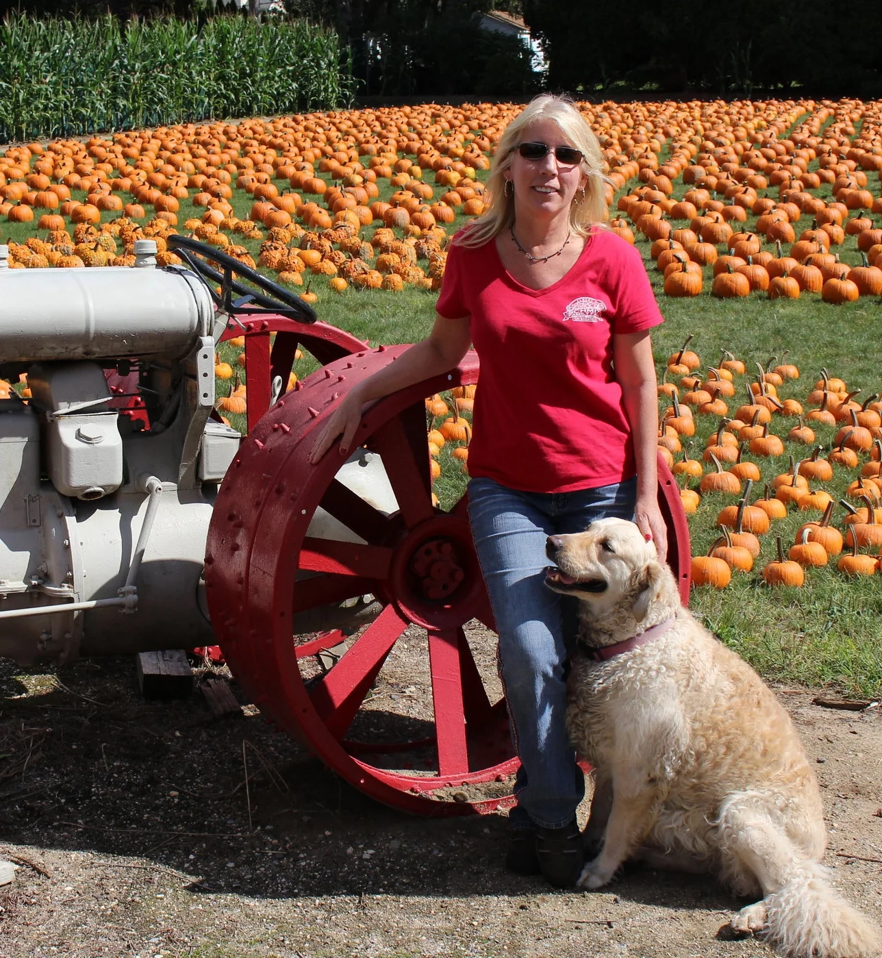 Jean Schmitt, co-owner of Albert H. Schmitt Family Farm in Dix Hills, and Cassidi, stand in front of the pumpkin field. Schmitt called the scenery the calm before the storm.