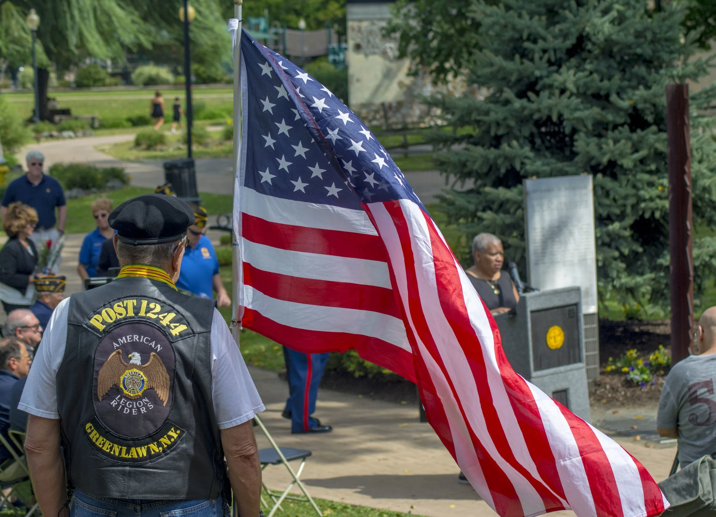 An American Legion Rider of Greenlawn Post 1244, left, holds an American Flag as Huntington Councilwoman Tracey Edwards, right, reads the names of Town of Huntington residents who died in the 9/11 terrorist attacks.