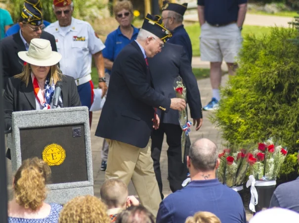 As Huntington Councilwoman Susan Berland, left, reads names of Town of Huntington residents who died in the 9/11 terrorist attacks, Huntington Veterans Advisory Board Member Bob Santo, center, sets down a rose in remembrance.