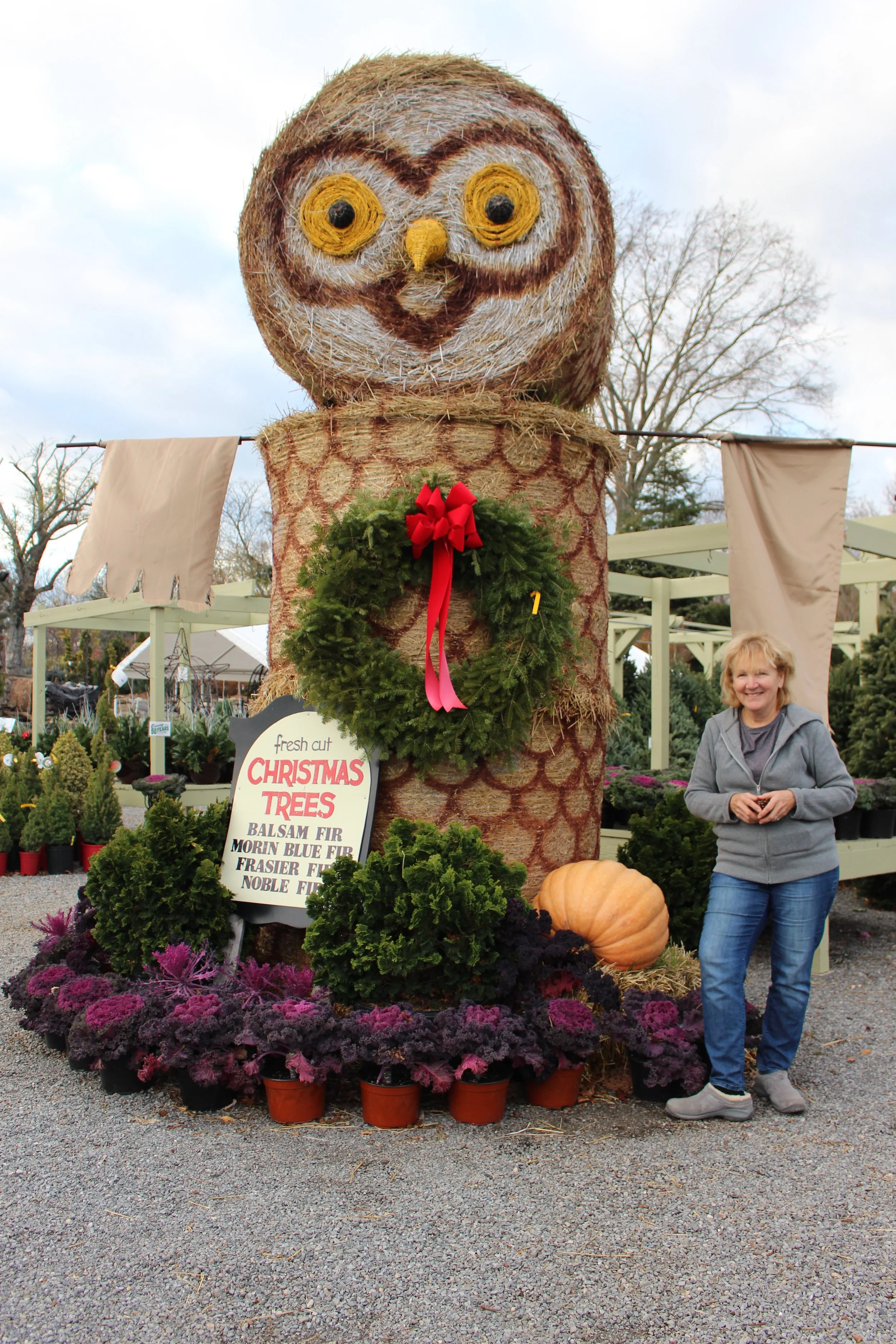 Donna Bemiss, owner of Oakwood Road Nursery, stands next to a giant owl made from hay and a sign listing the types of trees the nursery offers this holiday season.