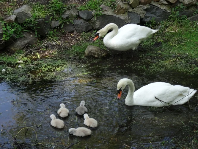 “Mr. and Mrs. Swan” observe their newborn cygnets.