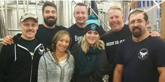 /Tim Kelly, of East Northport’s Lark Pub And Grub, is pictured with the team at Oyster Bay Brewing Company, where a solid Red IPA was recently brewed for the Lark.