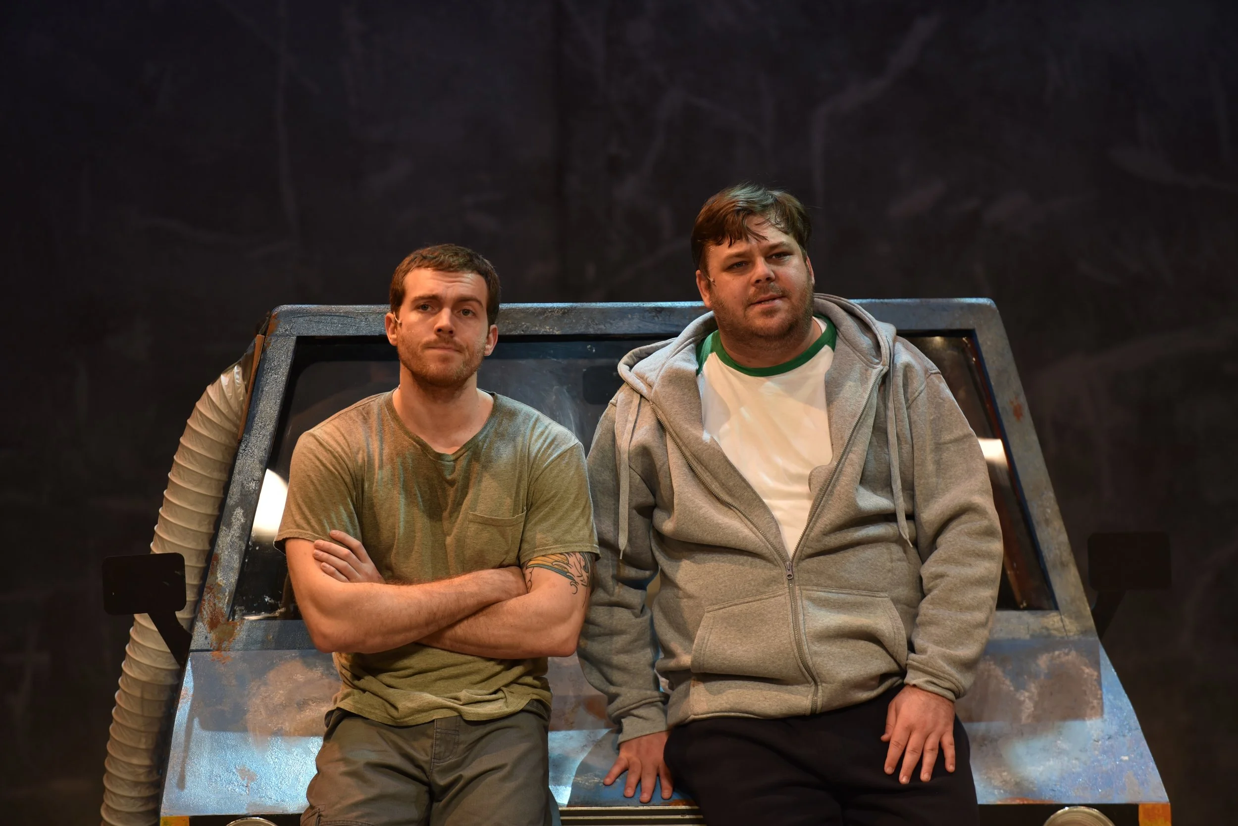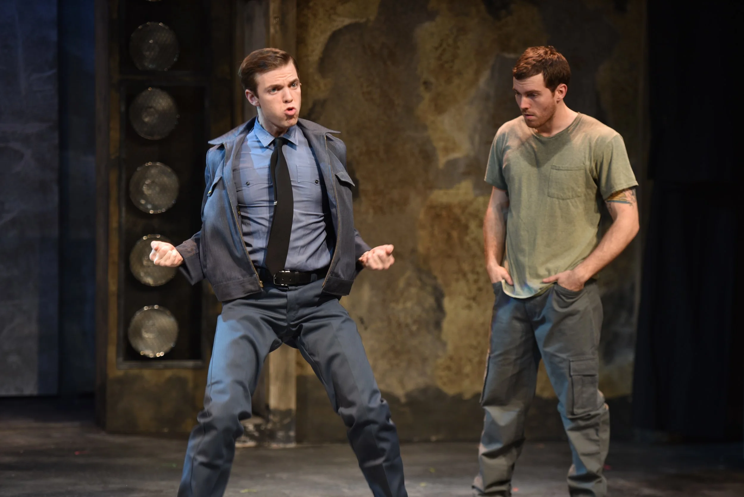 Following the hilarious number of a “Big-Ass Rock,” Brent Michael DiRoma (who plays Jerry Lukowski), left, teaches Spencer Glass (Malcolm MacGregor), right, the pelvic thrust, in John W. Engeman Theater’s production of “The Full Monty.”