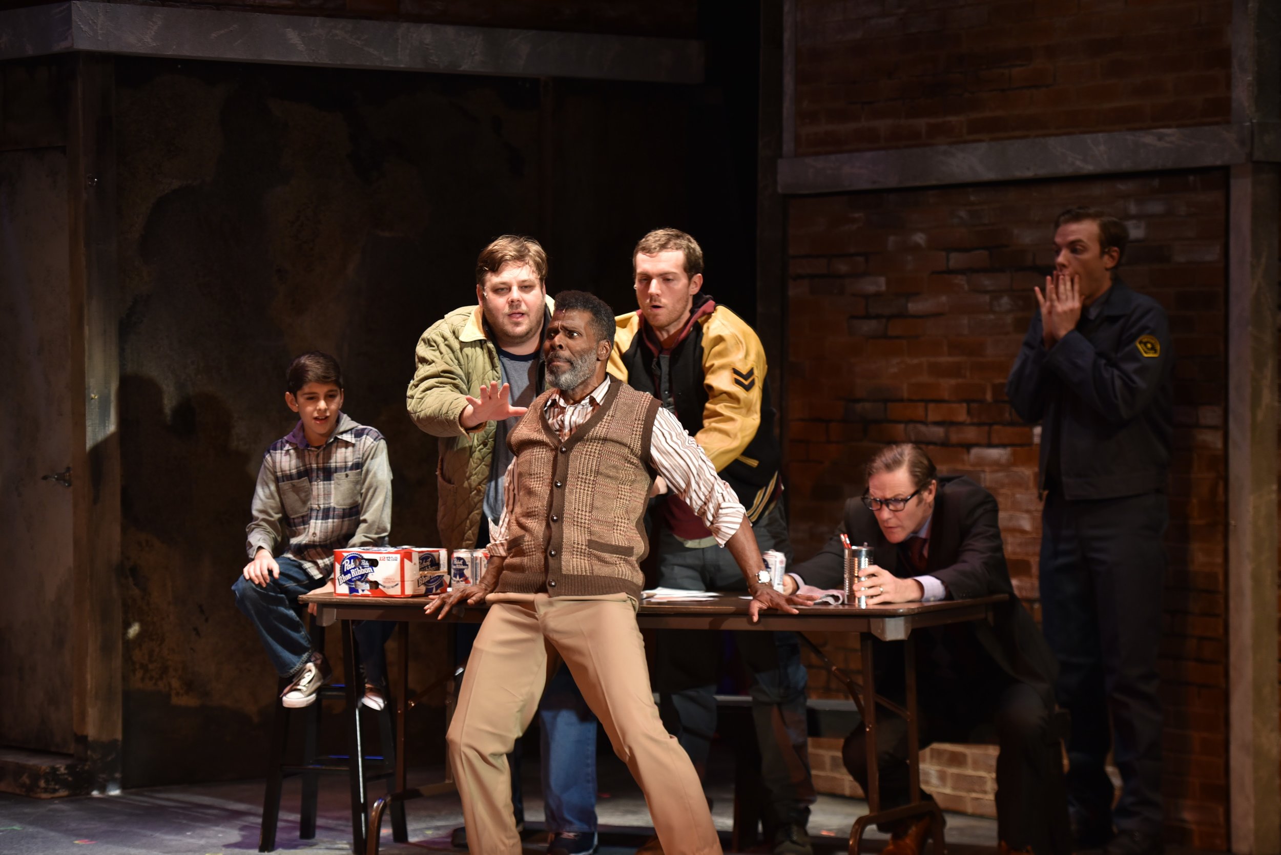 Pictured, from left, during the hysterical audition number of a “Big Black Man” in “The Full Monty,” are: Kyle Wolf (who plays the role of Nathan Lukowski), Ryan G. Dunkin (Dave Bukatinsky), Milton Craig Nealy (“Horse”), Brent Michael DiRoma (Jerry Lukowski), Peter Simon Hilton (Harold Nichols), and Spencer Glass (Malcolm MacGregor).