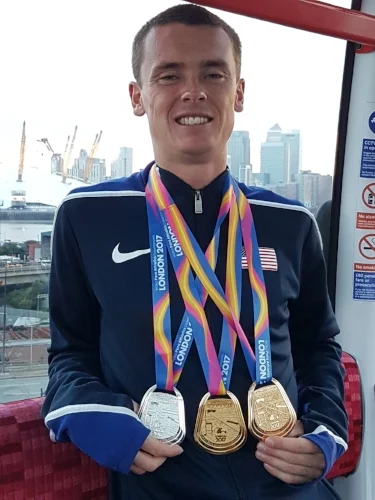 Mikey Brannigan, of East Northport, proudly dons the two golds and one silver medals he earned at the World Para Athletics Championships in London earlier this month.