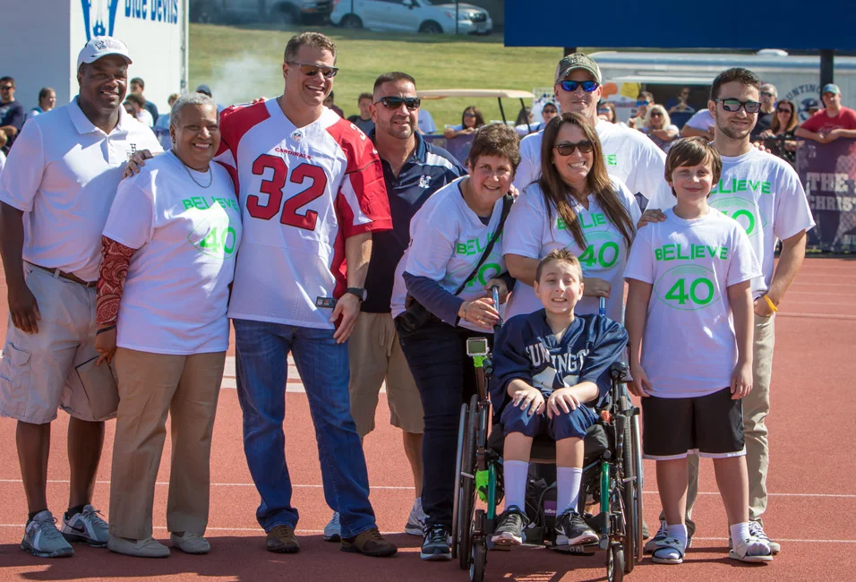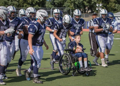 Eli Mollineaux, seated, has extremely rare mitochondrial condition Pearson’s Syndrome. On Saturday, the sophomore suited up alongside the Blue Devils football team and scored a 50-yard touchdown on an exhibition play in the third quarter.