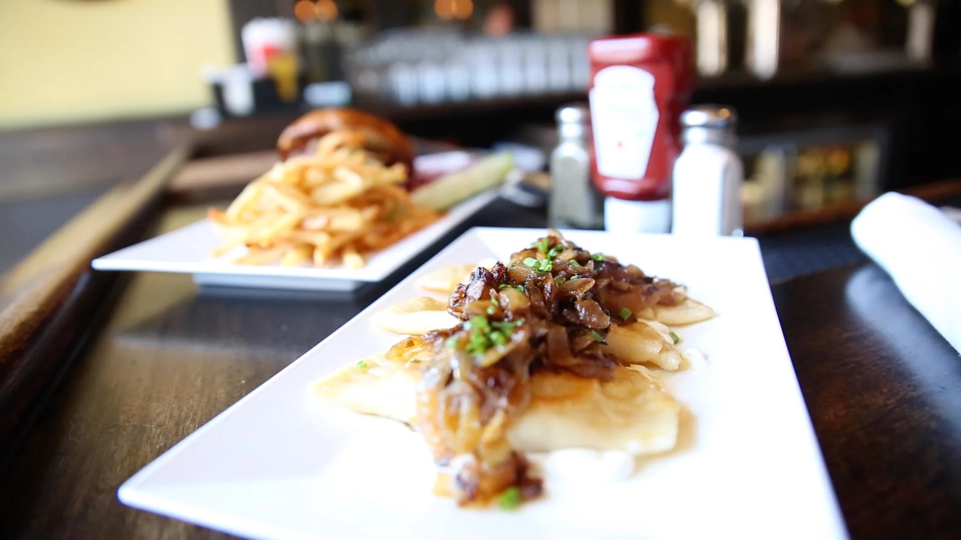 The homemade potato pierogi are fried but not greasy. The filling in the pierogi is creamy and served with caramelized onions and sour cream. This appetizer is sure to whet some appetites.