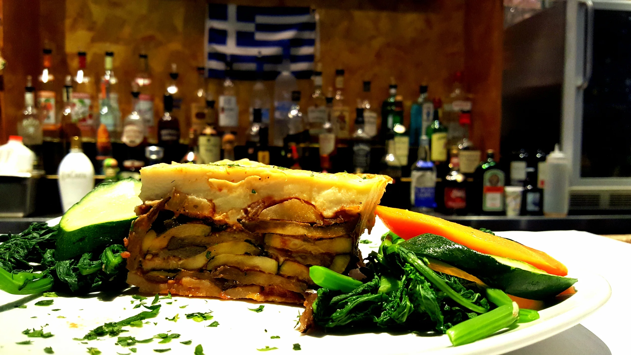 A vegetarian favorite, Neraki’s Moussaka is made with eggplant and zucchini over potatoes.