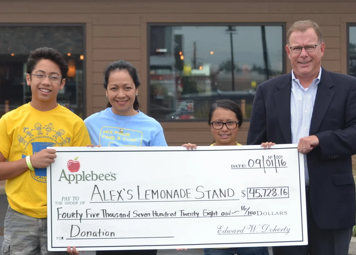 APPLEBEE’S AND LEMONADE STAND: Applebee’s Neighborhood Grill & Bar’s Long Island locations recently raised funds to support Alex’s Lemonade Stand Foundation, an organization dedicated to eradicate childhood cancer. The check of $45,728 was presented to Alex’s Lemonade Stand Foundation Ambassador Hero Family on Sept. 1. Throughout July, Applebee’s locations, including those at 105 Veterans Memorial Highway in Commack and 360 Walt Whitman Road in Huntington Station, raised a total of $16,604. All of the proceeds from sales of paper lemons, and 25 cents from sales of its lemonade drinks benefitted, the non-profit organization. In addition, customers were also asked to make donations during their meals. This is the 11th year that Applebee’s locations have supported the foundation, generating nearly $6 million in proceeds since 2005.