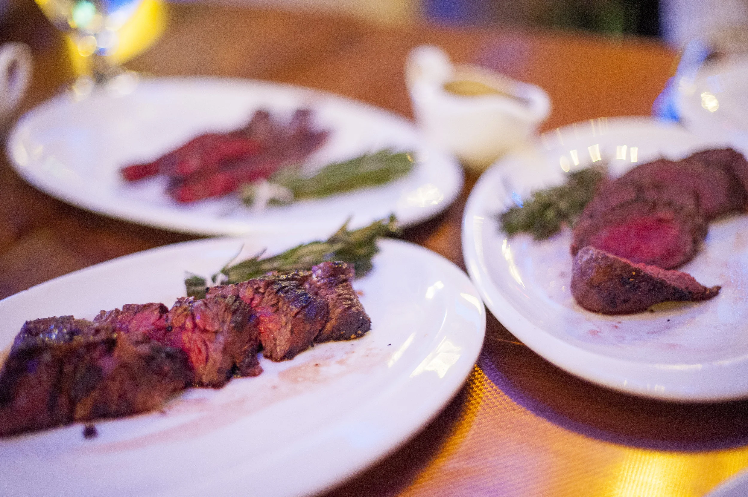 IMC serves these three cuts of Wagyu steak with bundles of rosemary and thyme to dip into a side of au jus sauce made from the beef’s own juices.