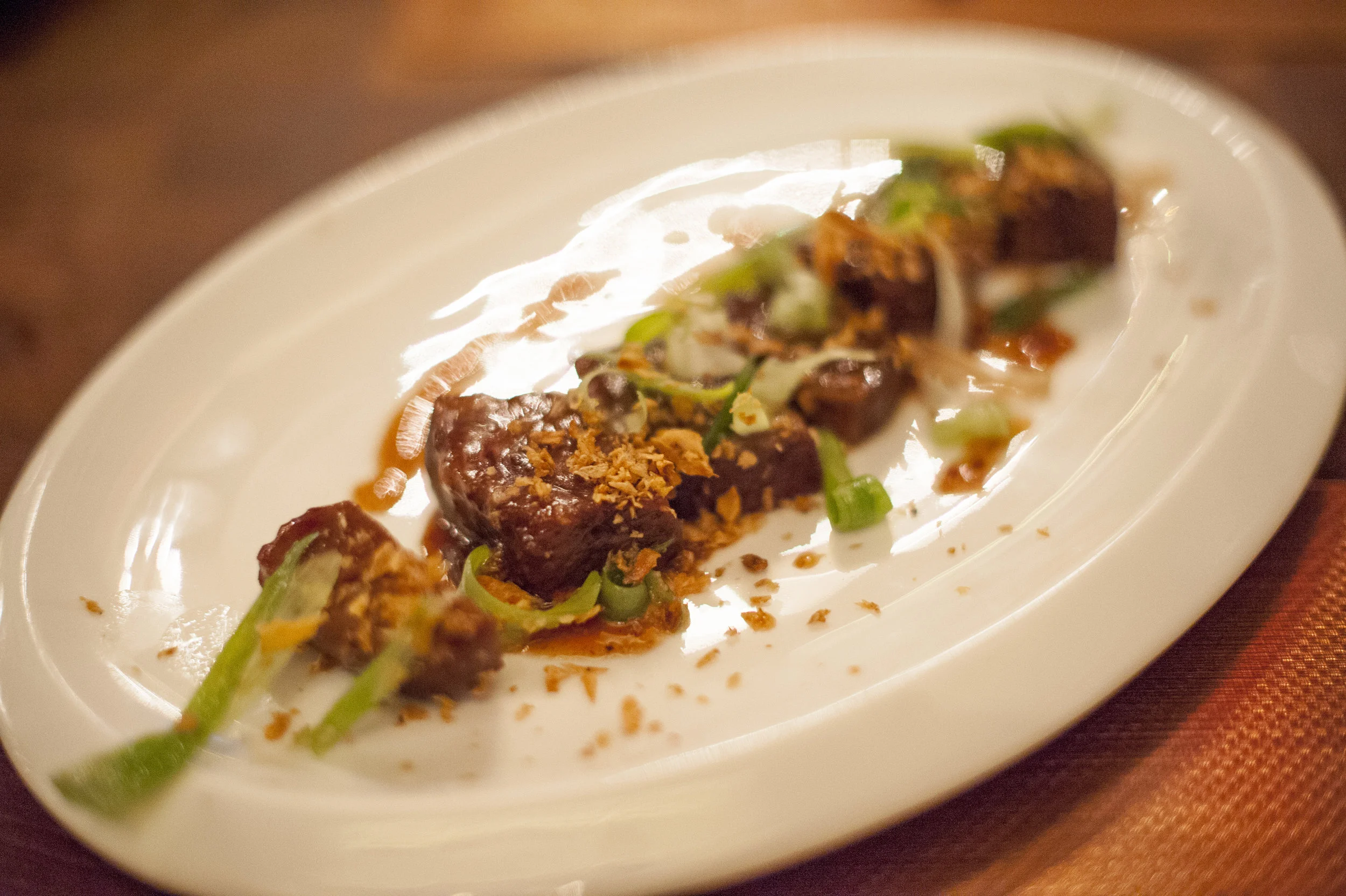 The braised Short Rib Bites are slow cooked, and dressed with a teriyaki glaze, sprinkled with fried shallots and fresh scallion.