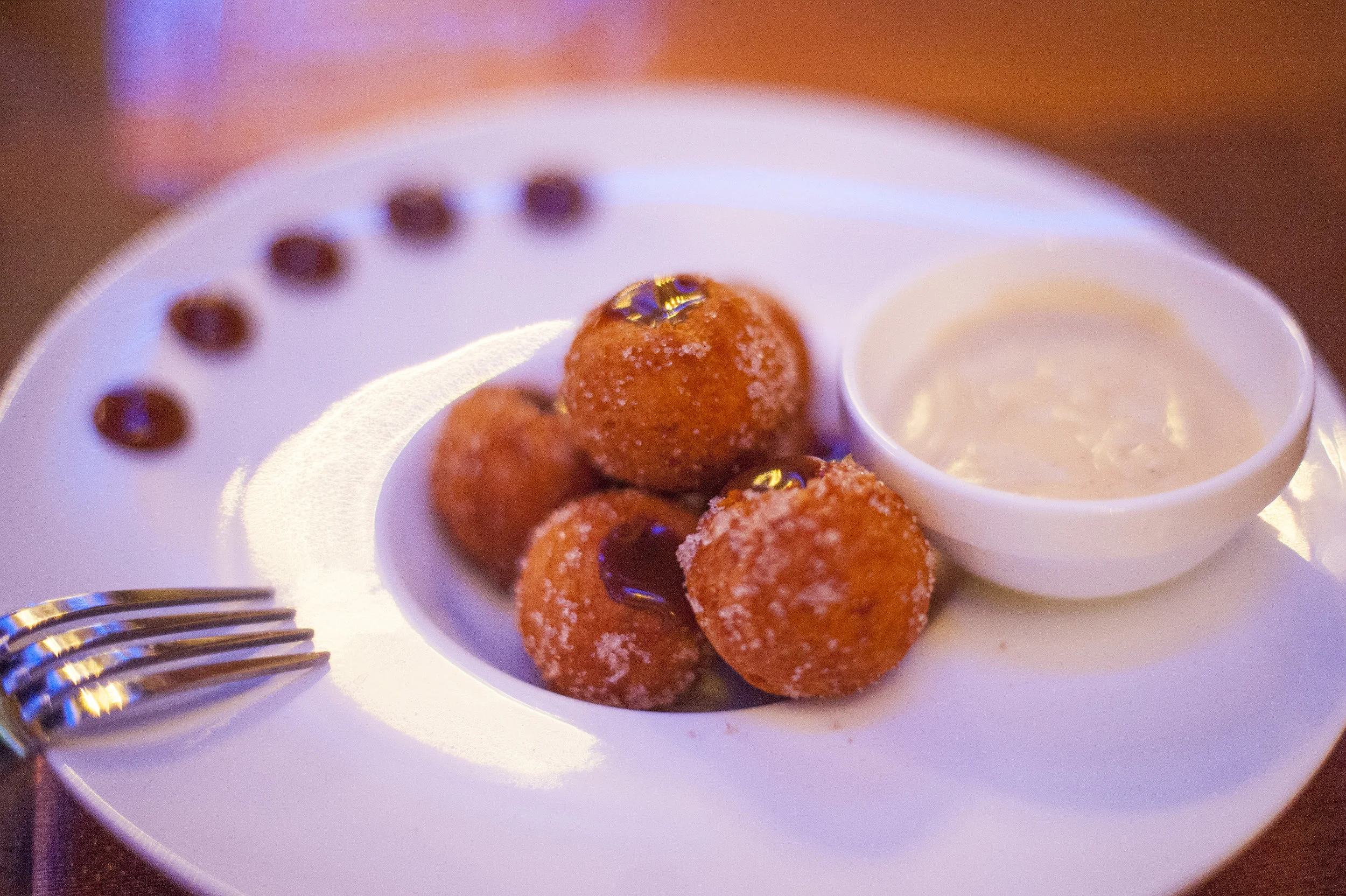 The IMC Donuts are filled with a warm dulce de leche, topped with cinnamon sugar, with a side of crème anglaise to dip for a delightfully decadent dessert.