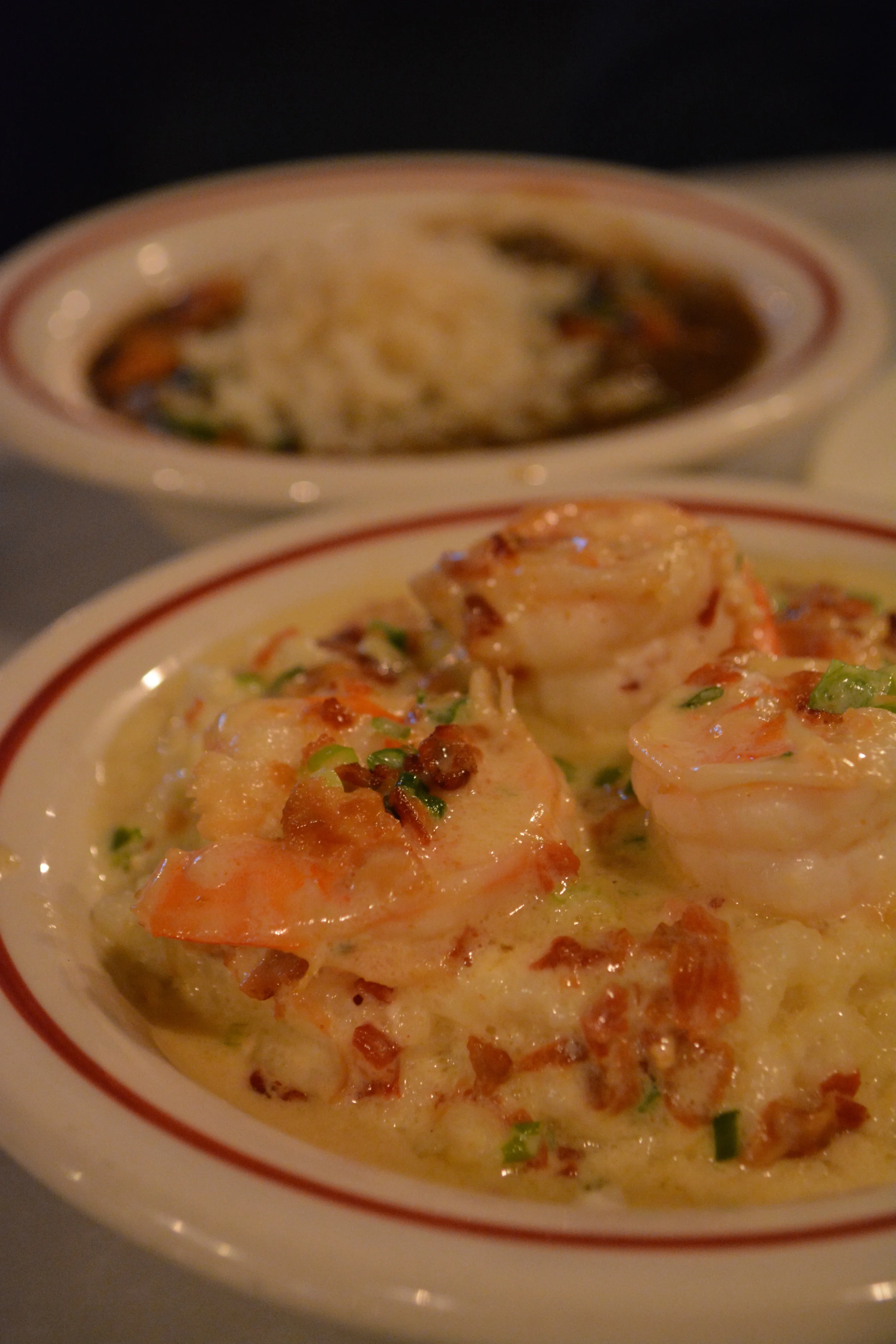 On the menu: Shrimp and Grits, jumbo gulf shrimp sautéed with bacon, scallions, white wine and cream, served over stone-ground sharp cheddar cheese grits