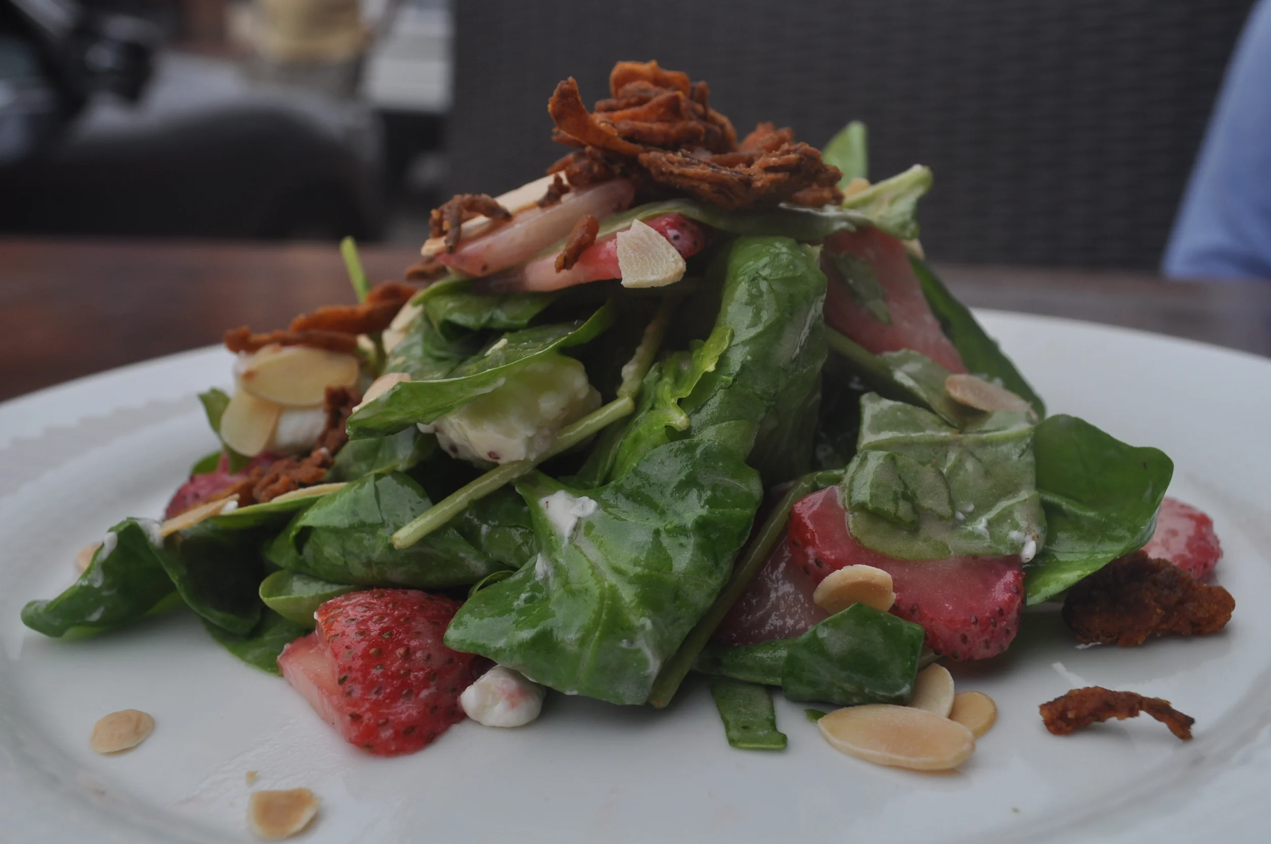 Or, turn to a perfect summer salad with the Strawberry Salad ($11), a light and fresh medley of baby spinach, toasted almonds, strawberries, champagne vinaigrette and a creamy touch of goat cheese.