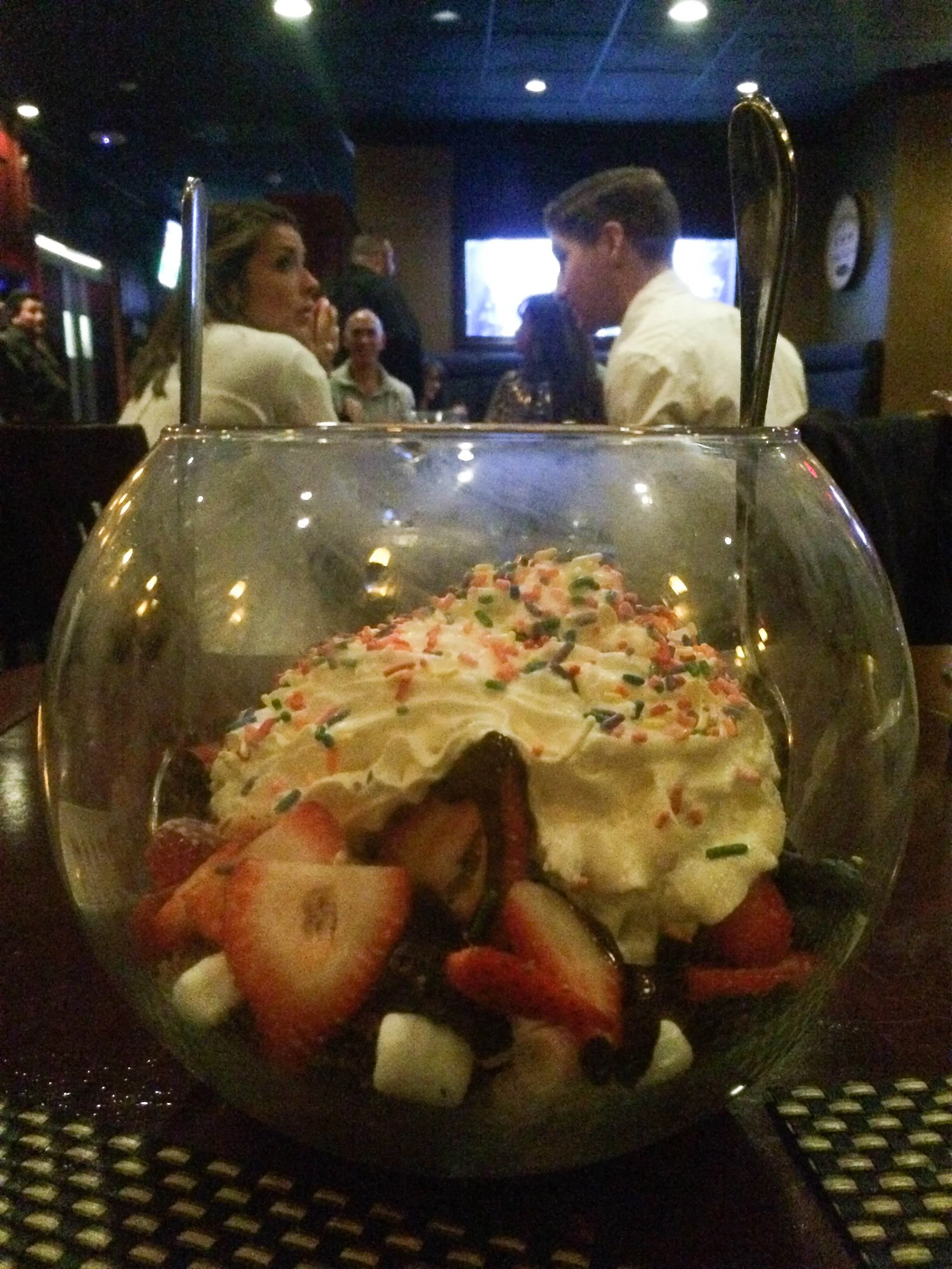 There is an item on the dessert menu labeled “Party In A Glass” ($14). If the menu listing were completely accurate, it would read, “gelato, marshmallows, berries and cookies, buried in whipped cream, served in a fishbowl and likely to induce wistful regret.”