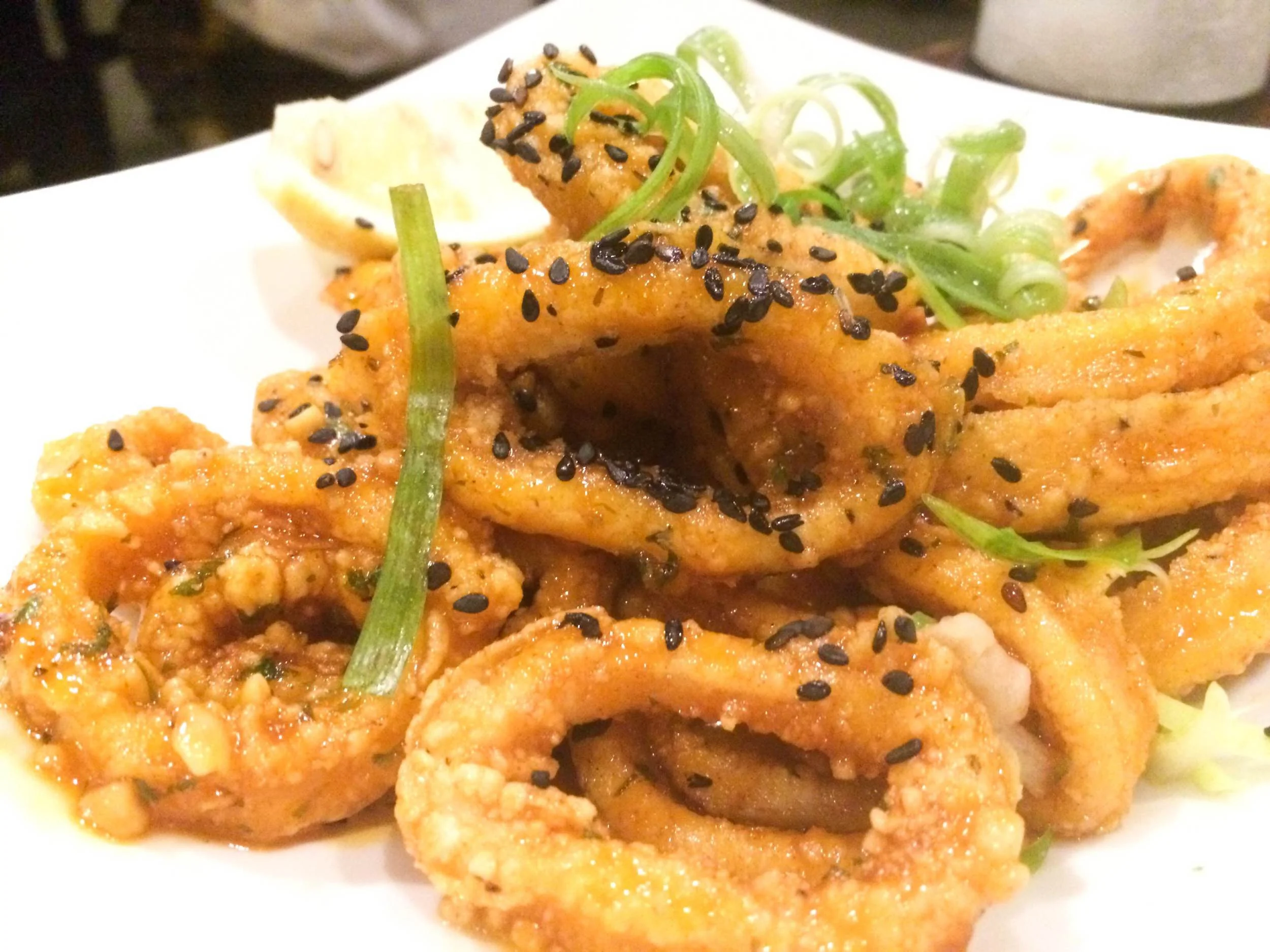 The Crispy Thai Style Calamari ($11), dressed in sweet red chile sauce, sesame seeds, scallions, cilantro and peanuts, is enough to – momentarily, at least – make the hesitant squid eater an enthusiastic one. Offsetting the unhealthful nature of the fried calamari last week was the summery Watermelon Salad – one of the week’s specials, which combined greens with watermelon, feta, diced onion and a vinaigrette dressing.