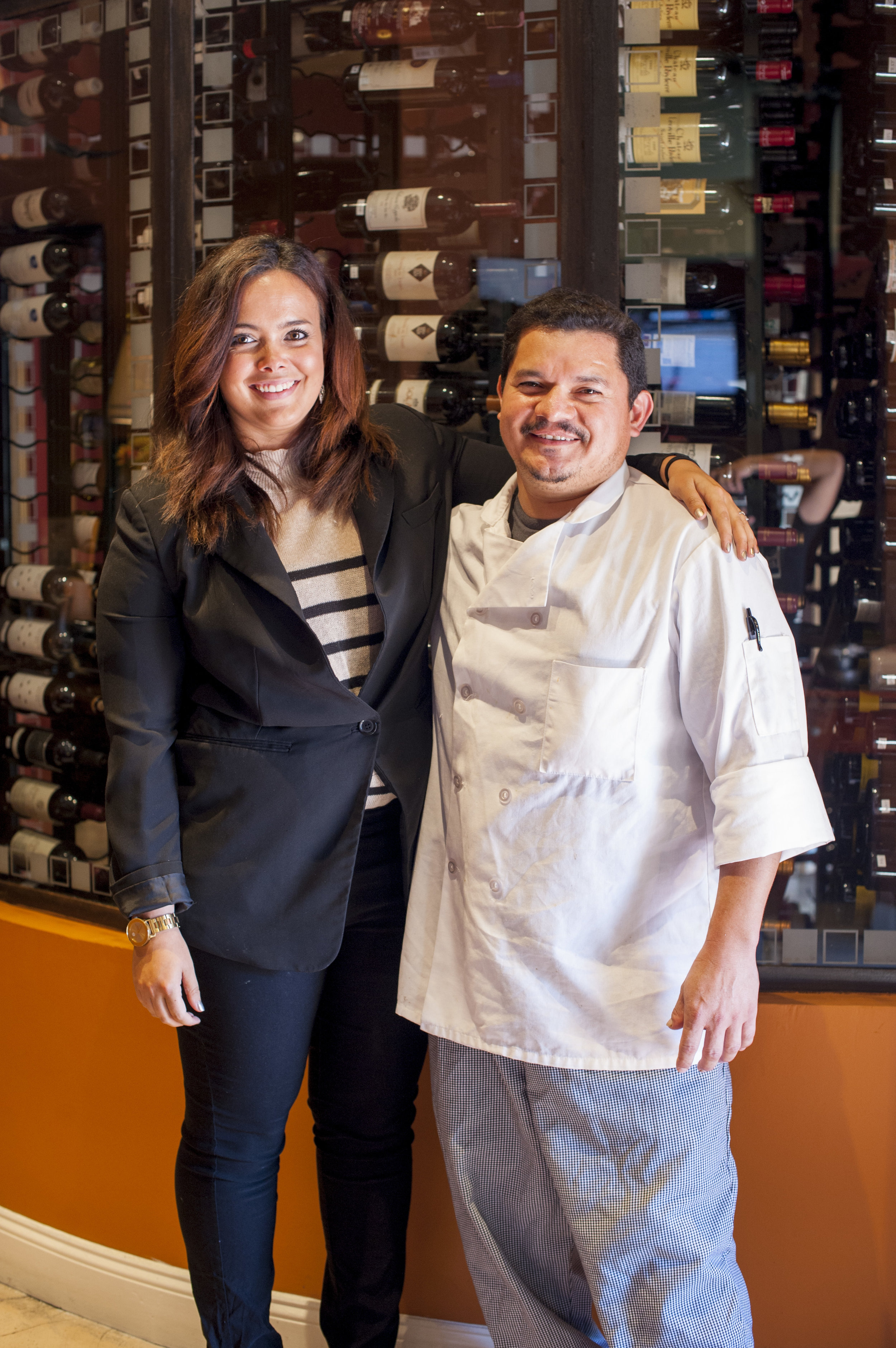 Mac’s Catering Manager Leanne Gelish and Executive Chef Rafael Salmeron stand before the numerous wine offerings available the Huntington village steakhouse.