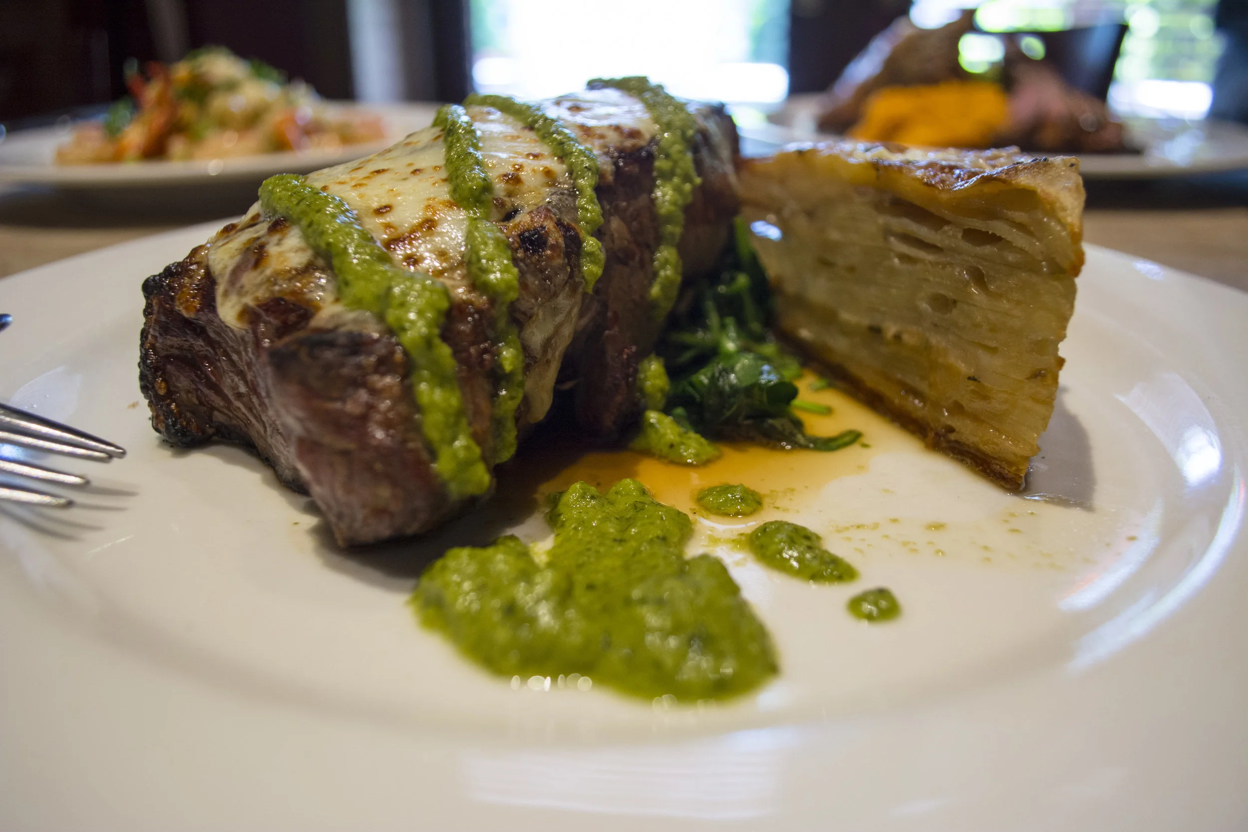 The robust, aged flavor of the steak is enhanced and balanced by the refreshing chimichurri sauce. And, the potato au gratin is baked layer by layer with a warm cheese sure that truly brings a sense of comfort to the dish.