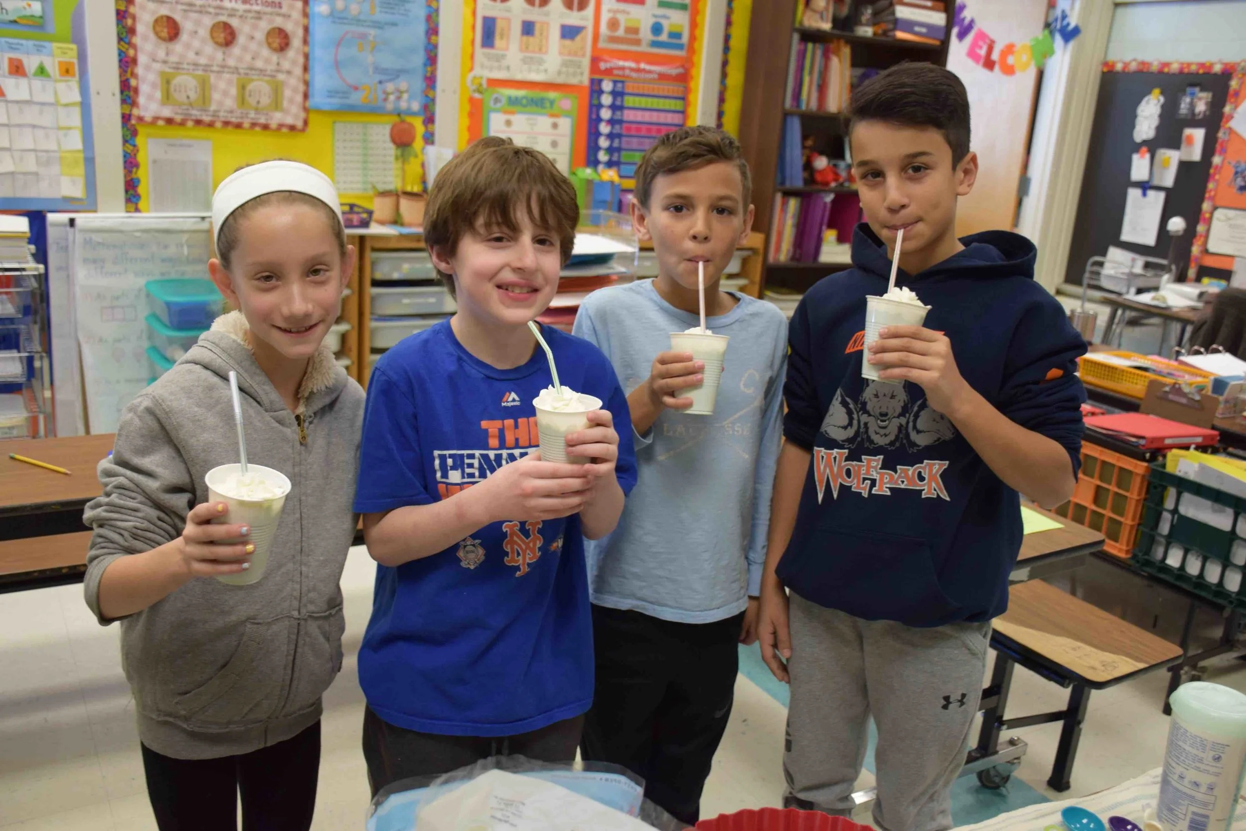 DELICIOUS: Students in Harborfields School District’s Thomas J. Lahey Elementary School recently learned the importance of fractions in everyday life by creating Shamrock Shakes in honor of St. Patrick’s Day. The students in Nancy Sordi and Melissa Reisen’s math classes learned how to properly measure ingredients and follow directions when determining how much of each item to put in the blender. Sordi explained to her classes that fractions are used constantly in daily life and particularly in cooking. Students put their fraction skills to the test with the end result being a delicious and healthy green shake. Classes sipped on their shakes while completing a worksheet as a group on what they learned. The students were also challenged to determine how much ingredients they would need to serve the shakes to a larger number of students.