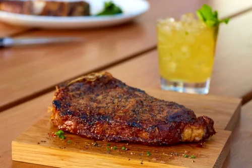 /Make dad feel like a king this Father’s Day with an 18-ounce, 28-day Bone-In Dry-Aged Strip Steak, above, paired with a Gentleman’s Mule, inset, made with Basil Hayden’s Aged Bourbon courtesy of Del Frisco’s Grille in Huntington Station.