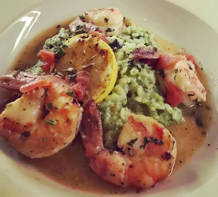 A lunch offering, the Shrimp Scampi at Ruvo in Greenlawn is served over pesto risotto with plum tomatoes and grilled lemon. Photo/Facebook/Ruvo