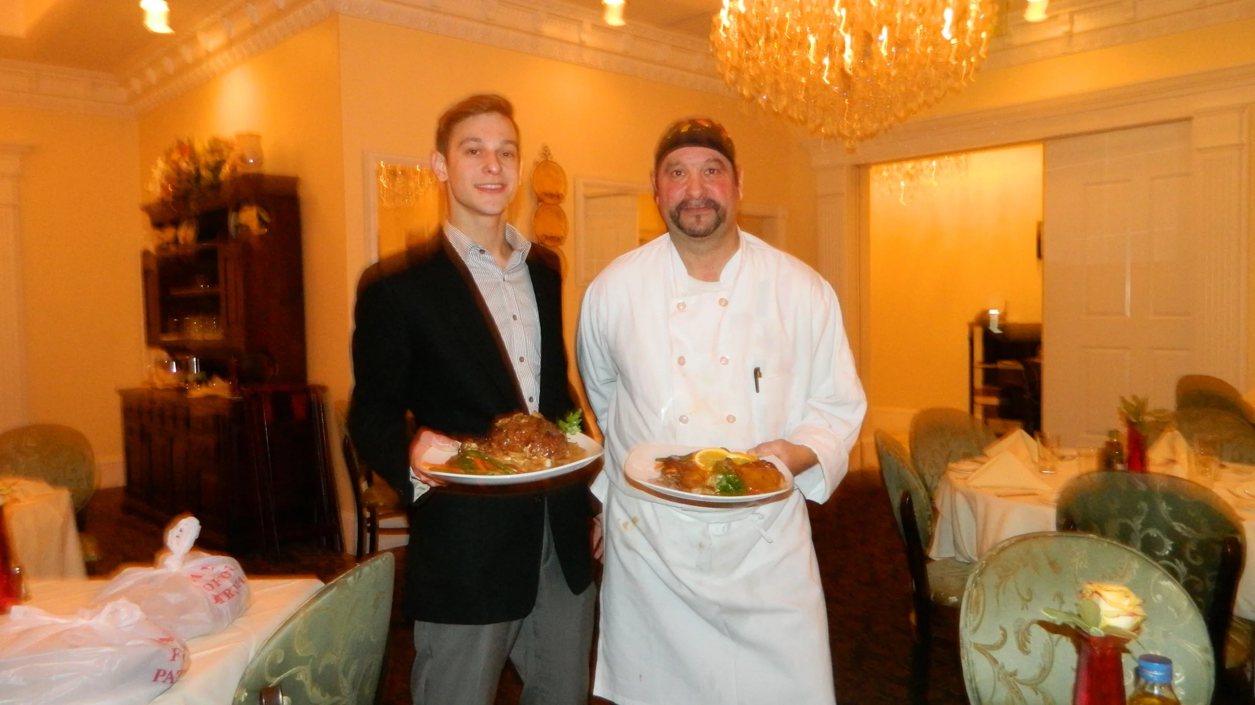 Cinque Terre owner, Chef Anthony Page, right, and son, Anthony, present crispy duck and stuffed pork chop entrees.