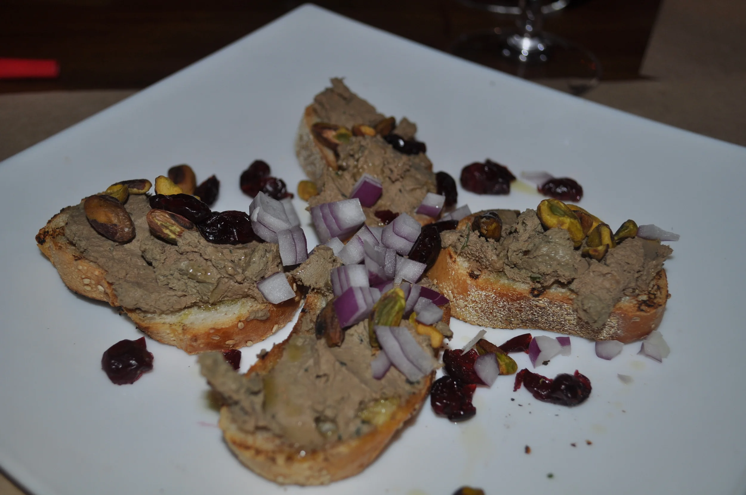 Joe started us off with something old and something new. The old would be Chicken Liver Crostini ($8), which will delight old souls everywhere as he takes his grandma’s chicken liver recipe, kicks it up with a little red pepper and piles it atop crisp crostini and finishes it off with chopped red onion, dried cranberries and pistachios.