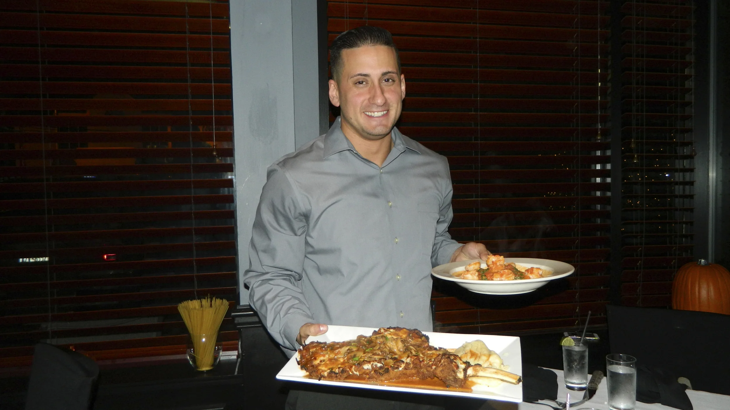 Andrea’s 25 Manager Tyson Loverro presents veal chop and shrimp Luciano entrees.