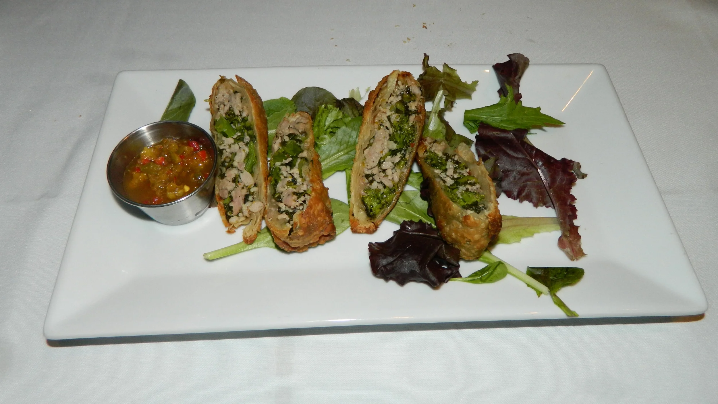 The broccoli rabe and sausage egg rolls with spicy Italian chimichurri sauce is an excellent appetizer.