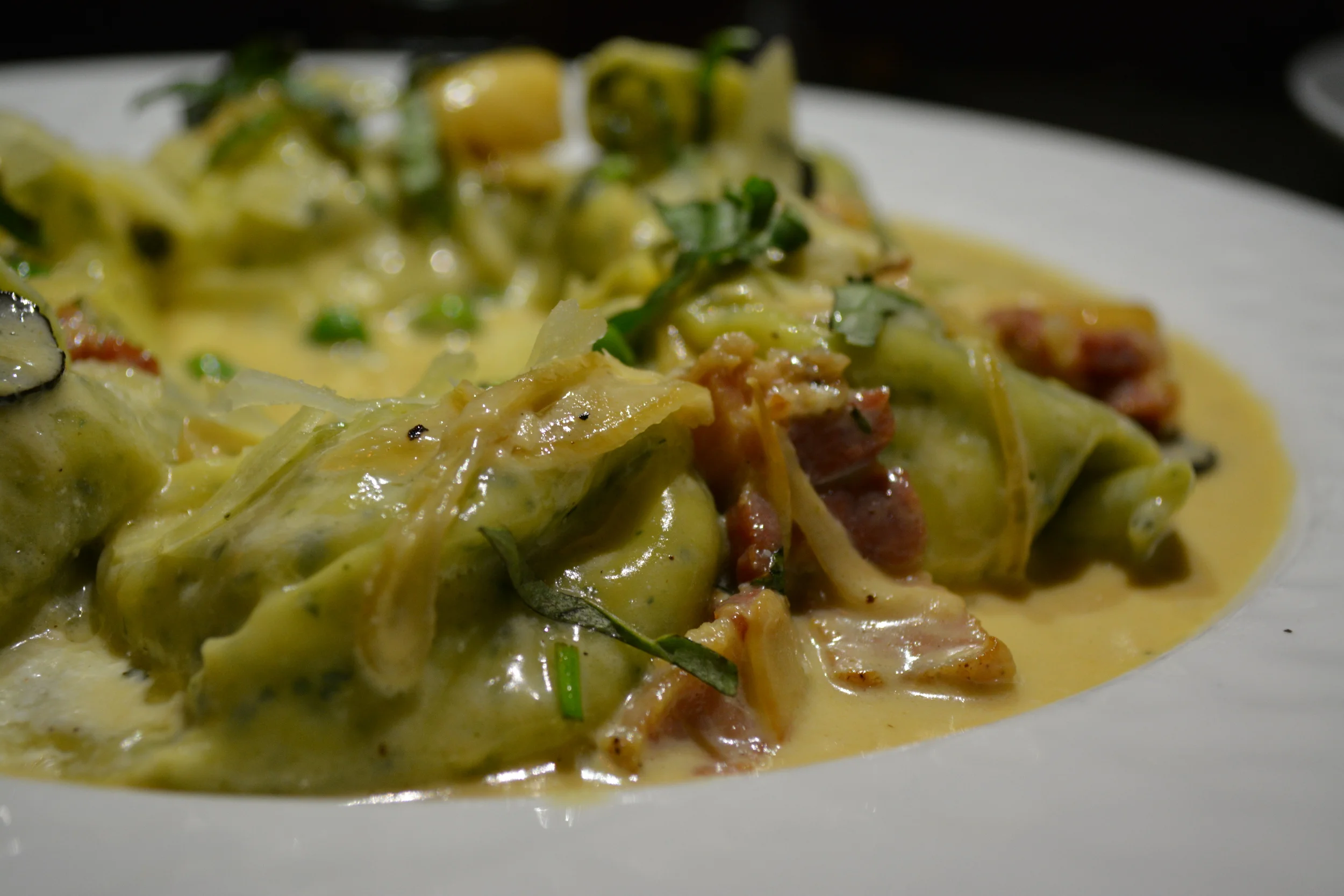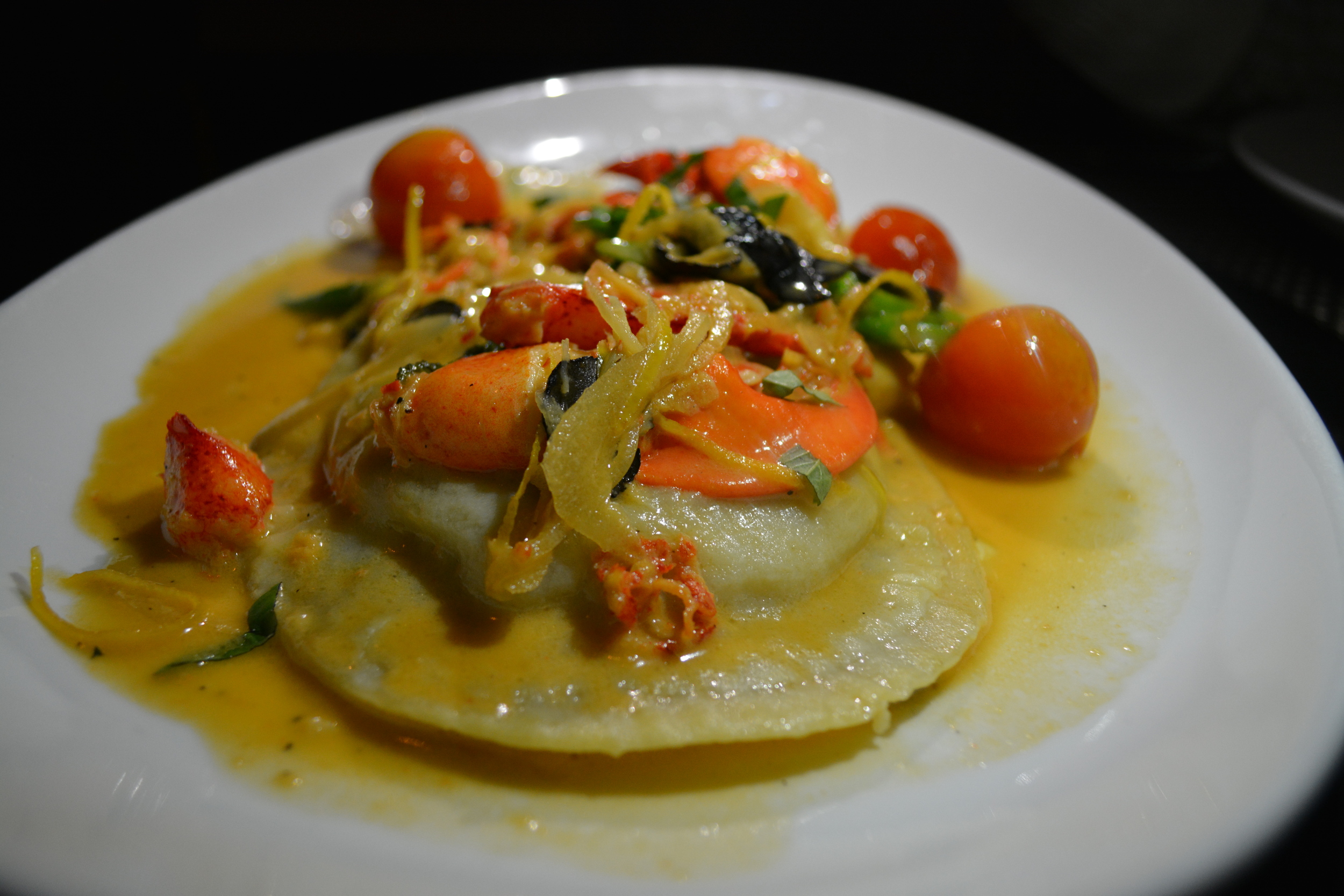 The Lobster Raviolo ($26) is a dish that combines sheep's milk ricotta, smoked mozzarella, egg yolk, asparagus and shaved black truffles. The circumference of each piece is the size of a standard drinking glass. When one takes fork or knife to pasta piece, slicing into its center, the egg yolk pours onto the plate.