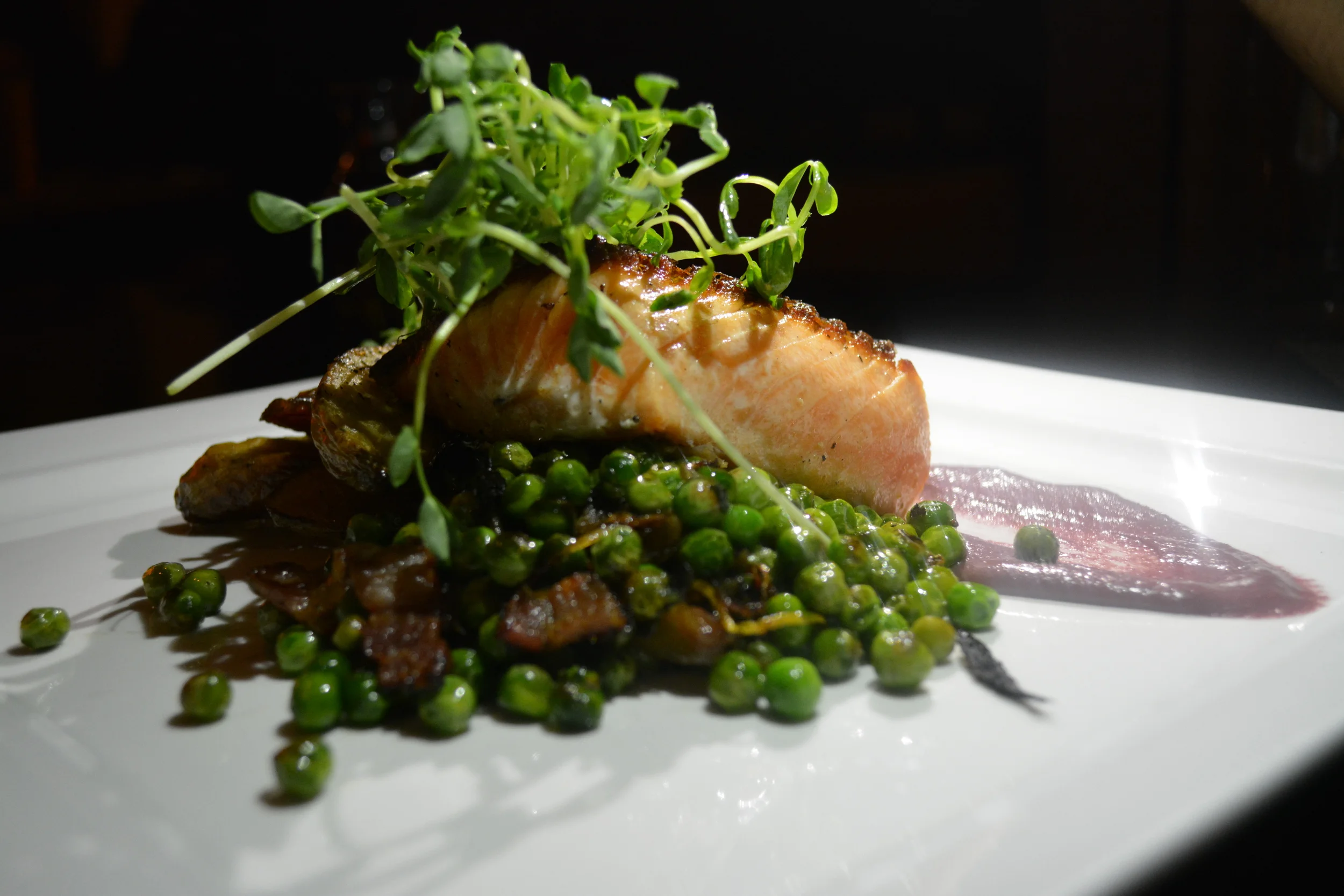 The Pan Seared Salmon ($27) looks like a scene from the depths of a forest. A piece of pink fish is surrounded by greens and pancetta, bordered on one side by crispy olive oil-poached fingerling potatoes and on the opposite side by a smear of purple mustard.