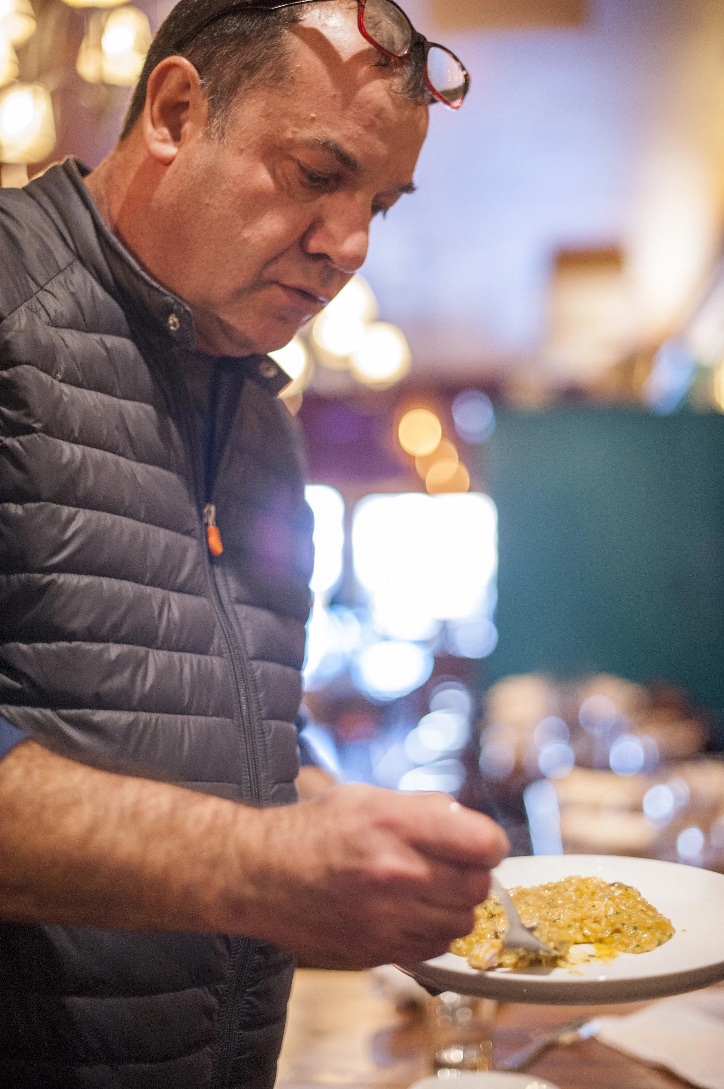 Nino Antuzzi, owner of Osteria Da Nino, samples a seafood risotto to ensure the finest quality in his cuisine.