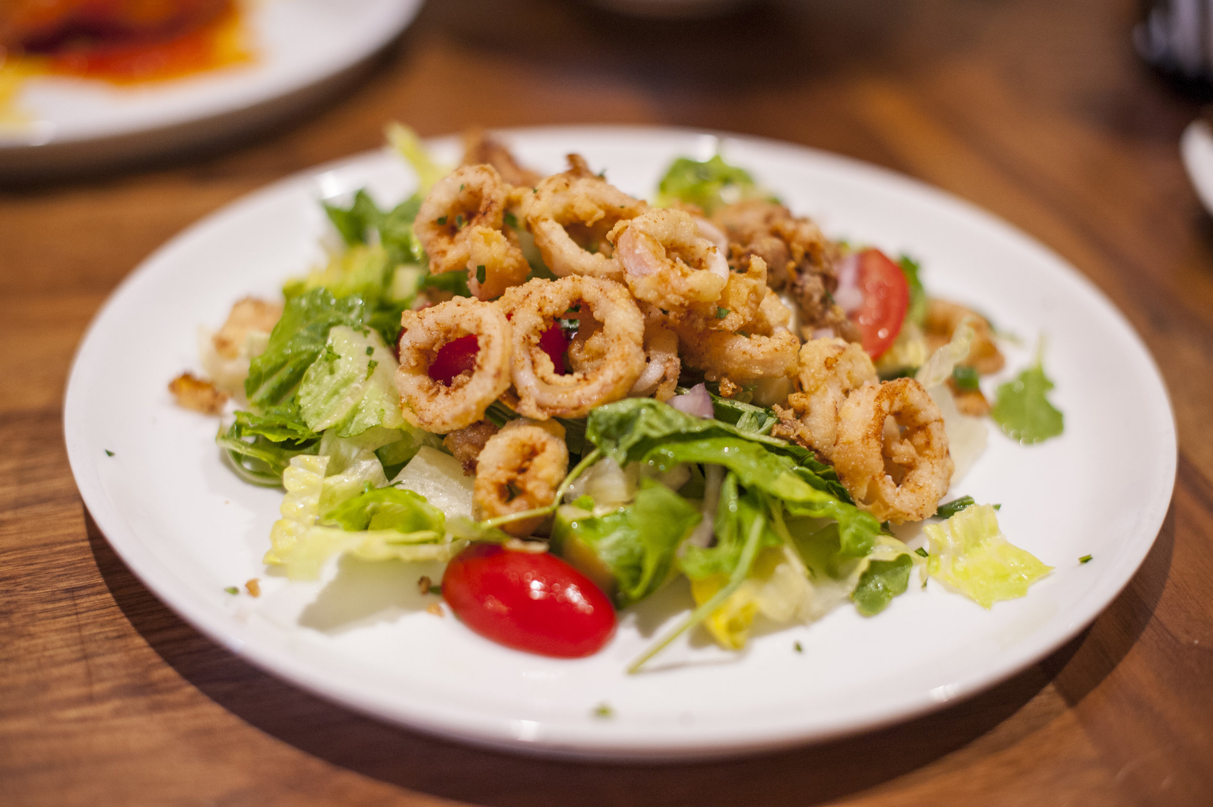 The zesty Nino Insalata serves up semolina dusted calamari, red onion, green beans, lemon vinaigrette, baby arugula, romaine lettuce, and halved grape tomatoes.