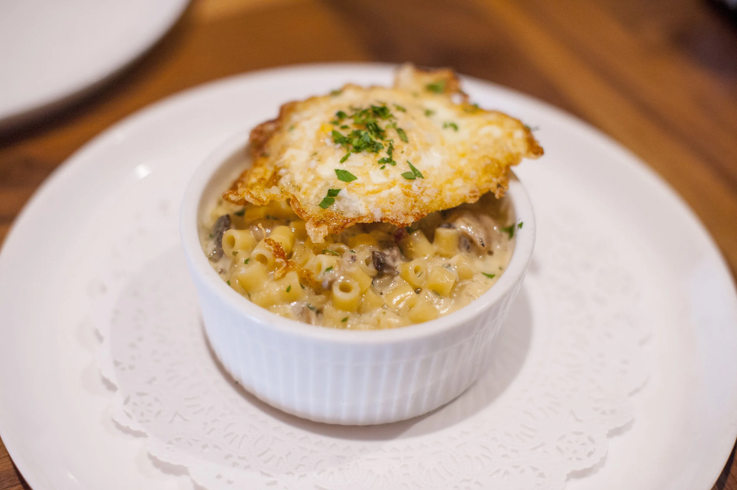The three-cheese Italian Mac and Cheese combines parmigiana regiano, gorgonzola, and mozzarella with an organic friend egg for a decadent appetizer.