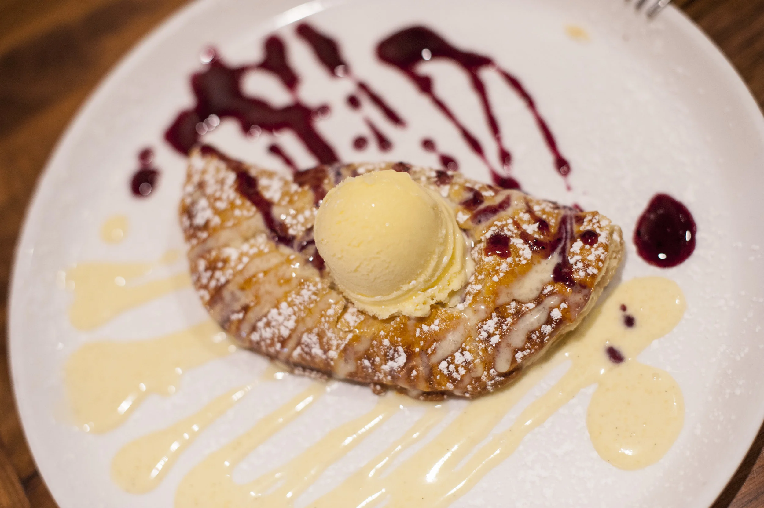 The warm and flakey Apple Turnover is topped with vanilla gelato, paired with raspberry and custard sauce.
