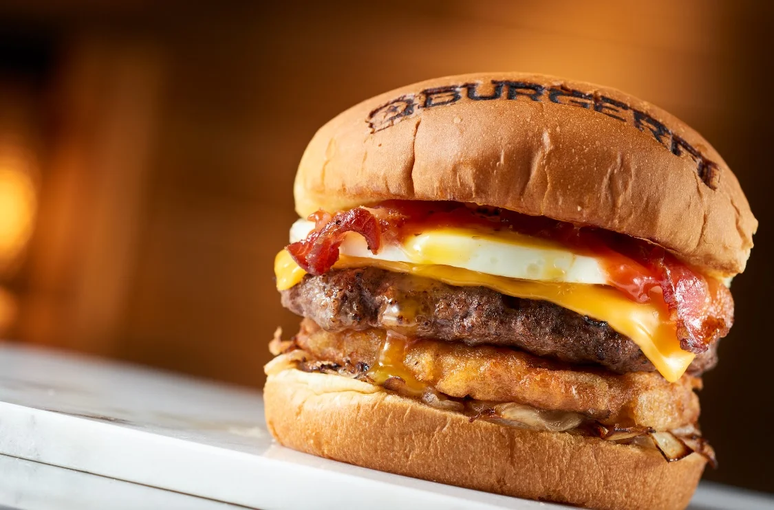 /The All-Day Breakfast Burger at BurgerFi, which was set to open its brand new Commack location yesterday, is made with a natural Angus burger, American cheese, bacon, maple syrup, fried egg, hash brown, grilled onions and ketchup.