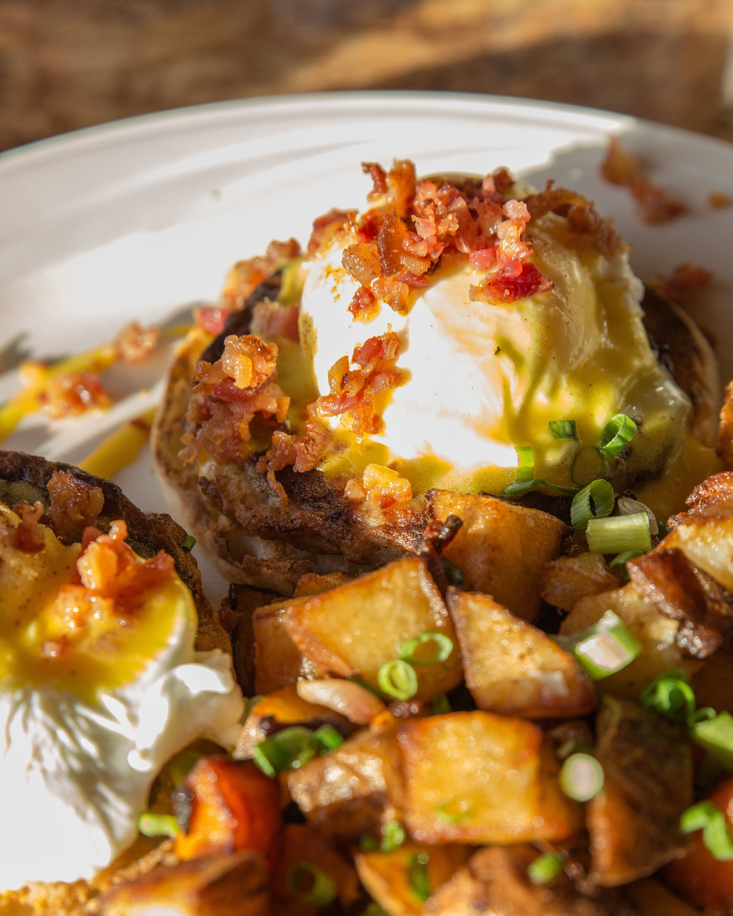 The Chef Benedict, is reminiscent of an open sandwich, serving up two poached eggs over sausage patties and English muffins, topped with Hollandaise and chopped bacon.