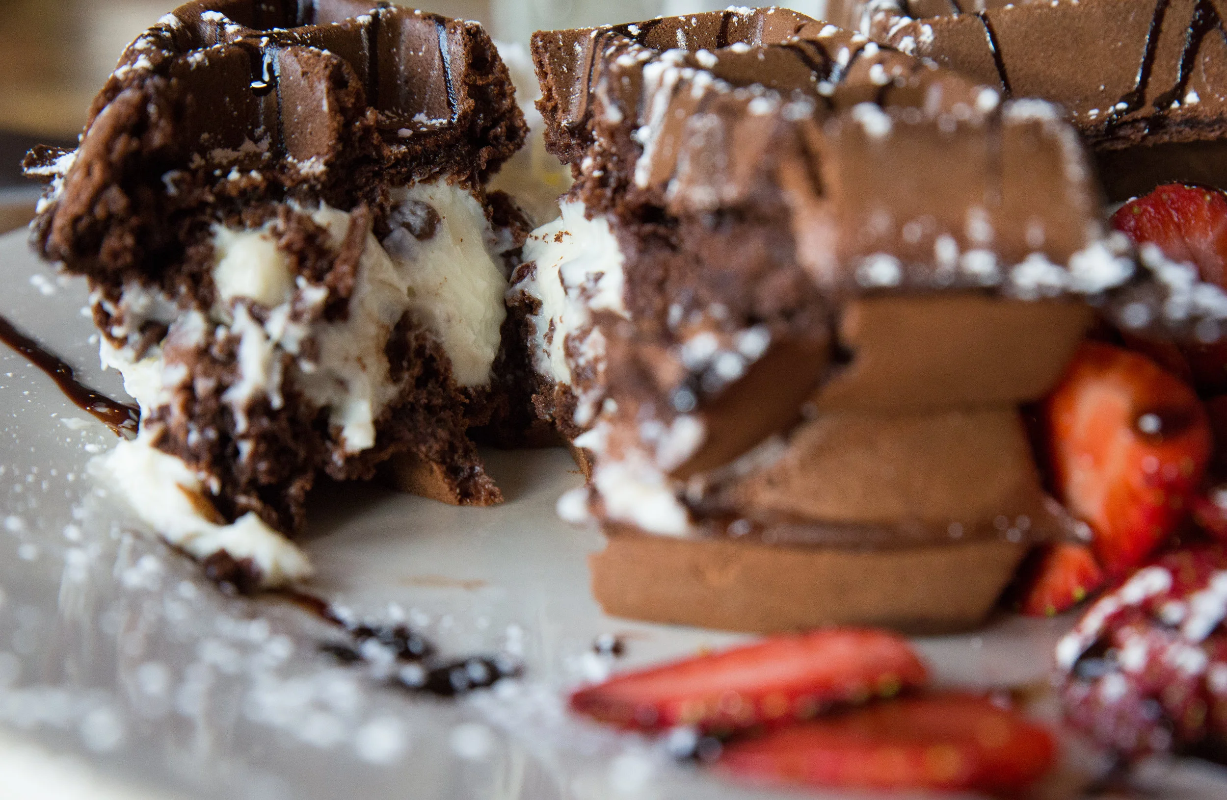 The Chocolate Stuffed Cannoli Cream Waffle is a chocolaty take on the Italian staple dessert and is served with cut strawberries and whipped cream for a fruity and creamy mix of delights.