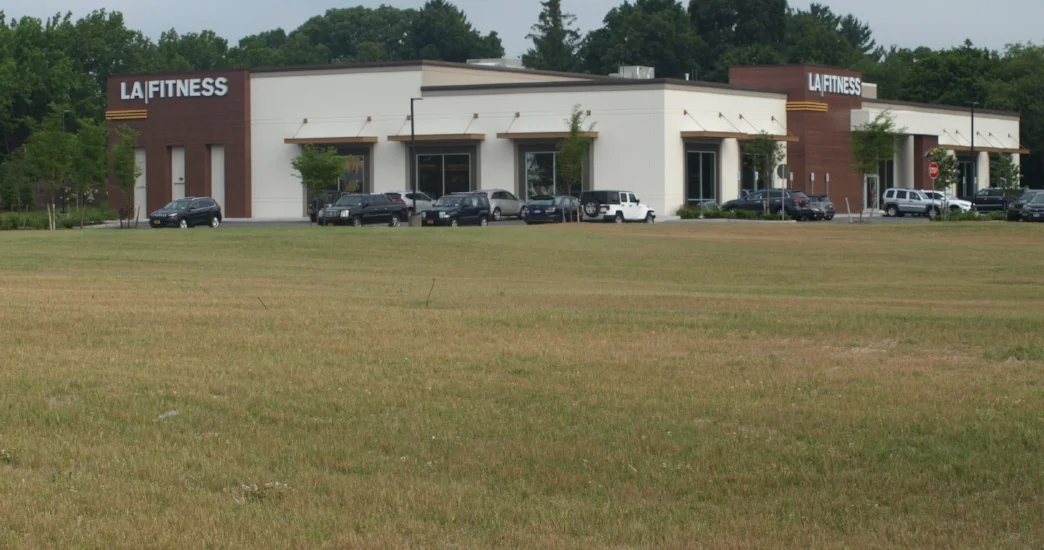 /Plans submitted to the town call for the construction of a Starbucks with a drive-thru on this vacant plot in front of LA Fitness at the corner of West Hills Road and Jericho Turnpike in Huntington Station. (Long Islander News photo/Connor Beach)