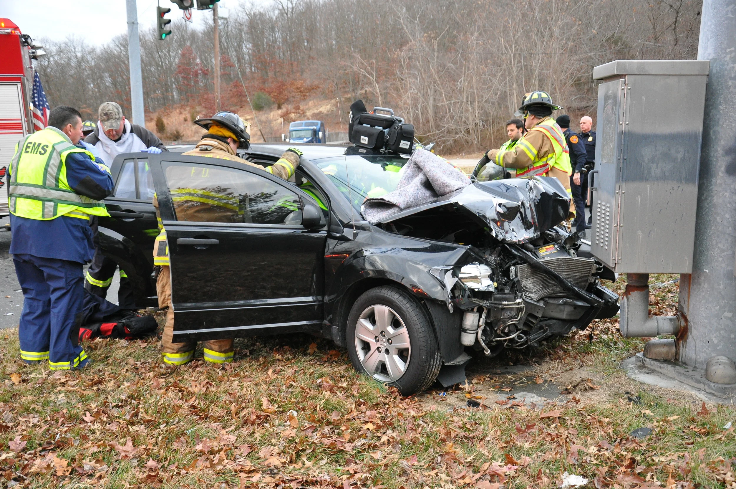 /First responders from the Dix Hills Fire Department work on one of the cars involved in a two-car crash in Dix Hills on New Year’s Eve. (Photo by Steve Silverman).