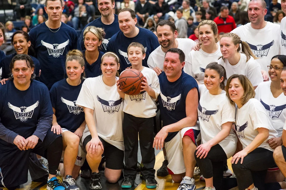Eli Mollineaux stands in the center of the faculty players of the Eli’s March Madness game at Woodhull Intermediate School.