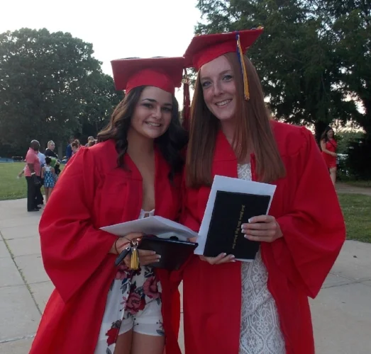 Half Hollow High School East grads Julia Bretschneider and Jenna Bottone smile with diplomas in hand. (Long Islander News photo/Rachel Stanislawek)
