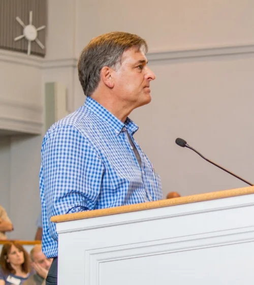Huntington-based Airbnb host Philip Giovanelli speaks during Tuesday’s hearing.