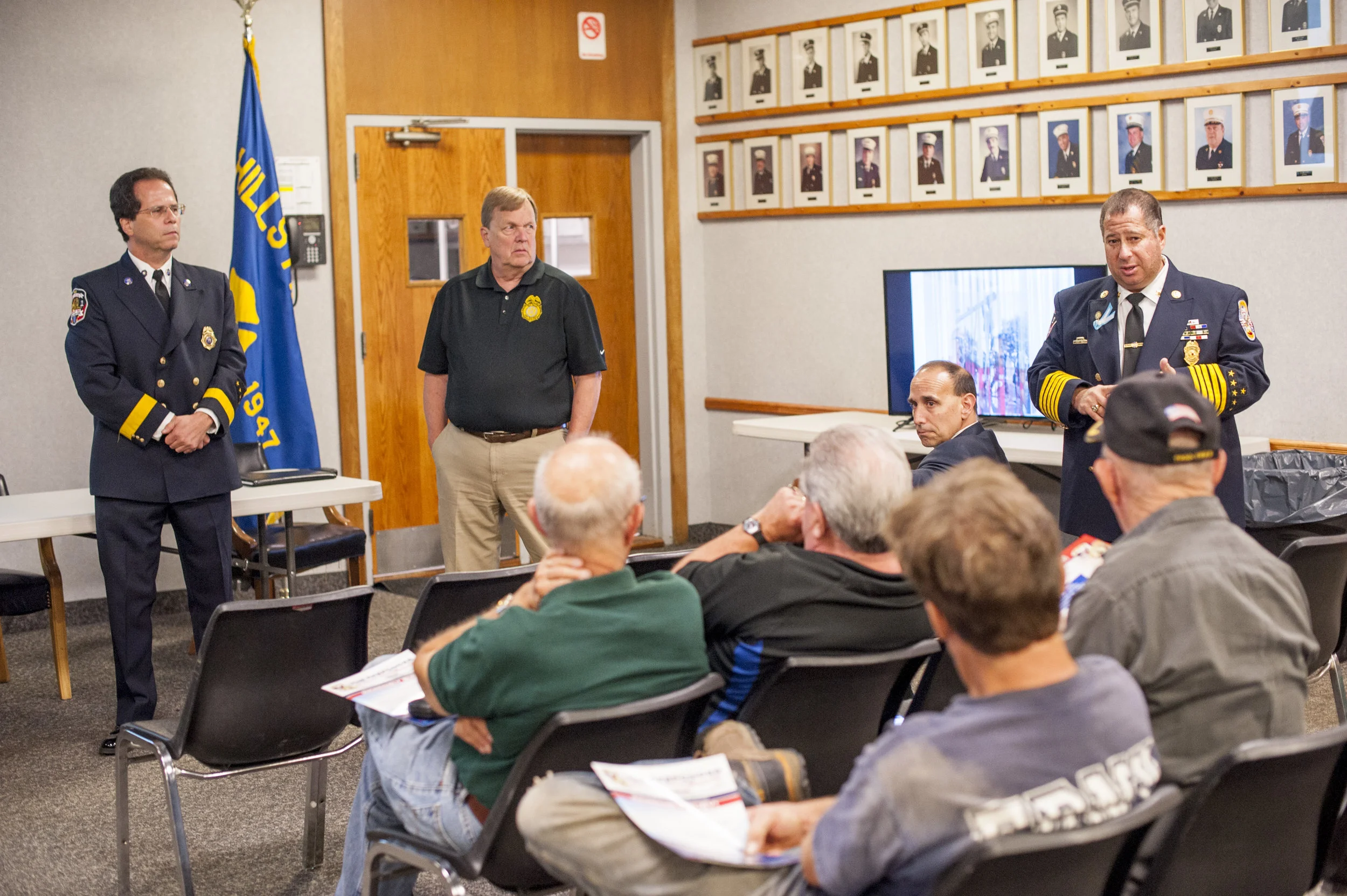 Dix Hills Fire Department Commissioners Michael Plumitallo, far left, and Larry Feld, far right, explained the need for headquarter renovations at the department’s first community meeting regarding the issue.