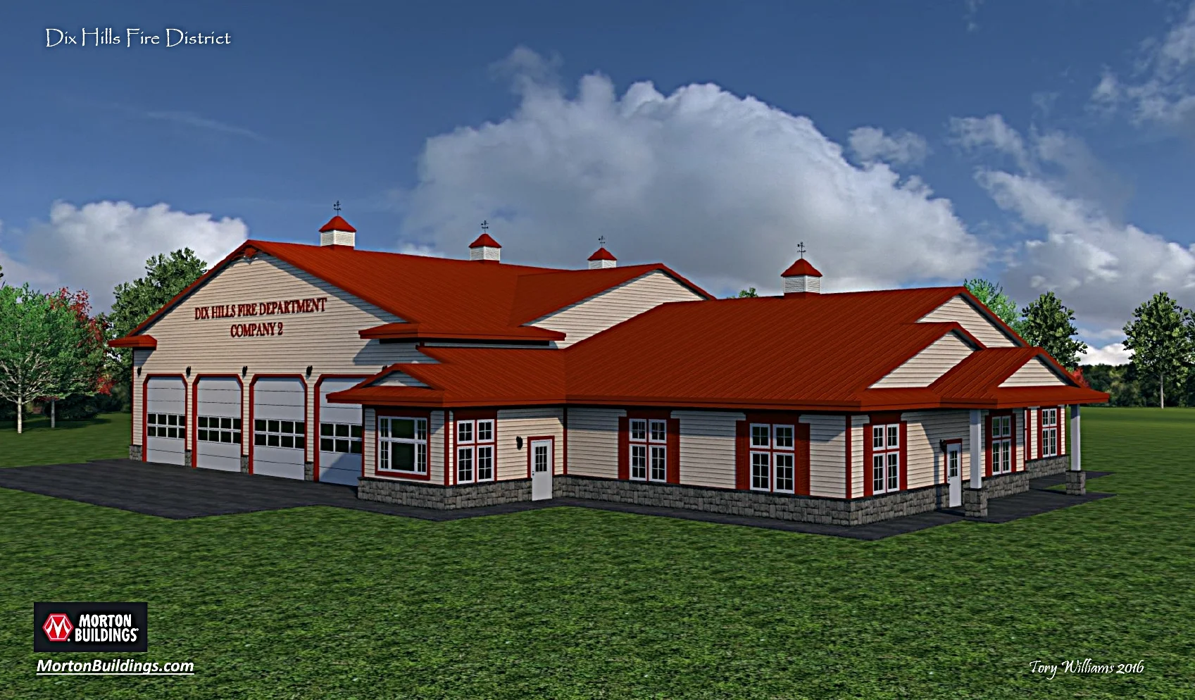 A rendering depicts a pre-engineered building north of the existing Dix Hills Fire Department headquarters that is planned to be built on Deer Park Road, and would take over rescue operations from the existing headquarters.