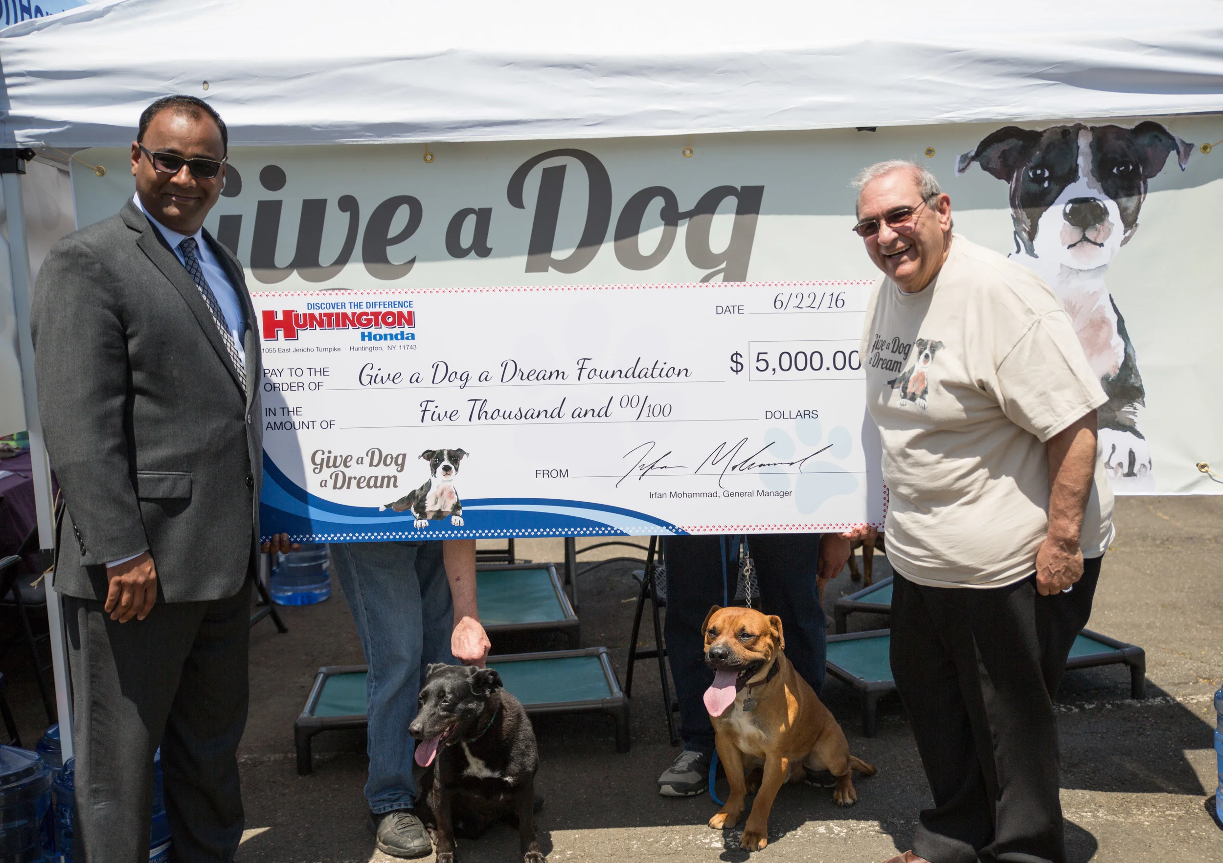 Give A Dog A Dream is the non-profit the town created to raise money earmarked for providing specialized services for dogs at the animal shelter. As part of its support for Give A Dog A Dream, Huntington Honda committed to making a donation for every car sold in April and June, up to $5,000. The dealership also sponsored the two adoption events.